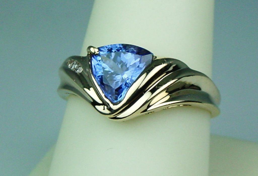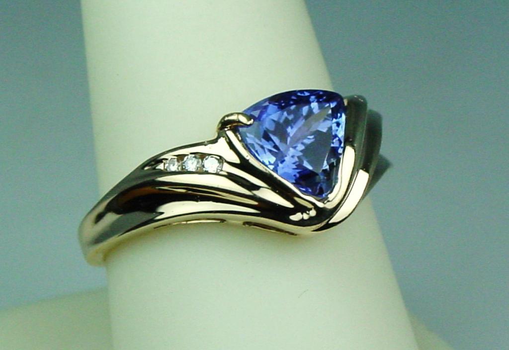Dazzling 14 karat yellow gold ladies custom  made ring fine set with a center trilliant  cut intense purple Tanzanite weighing approx.  2.00 carats and side channel set diamonds.  Retail $2,950.00 Estimate $800-$1,500