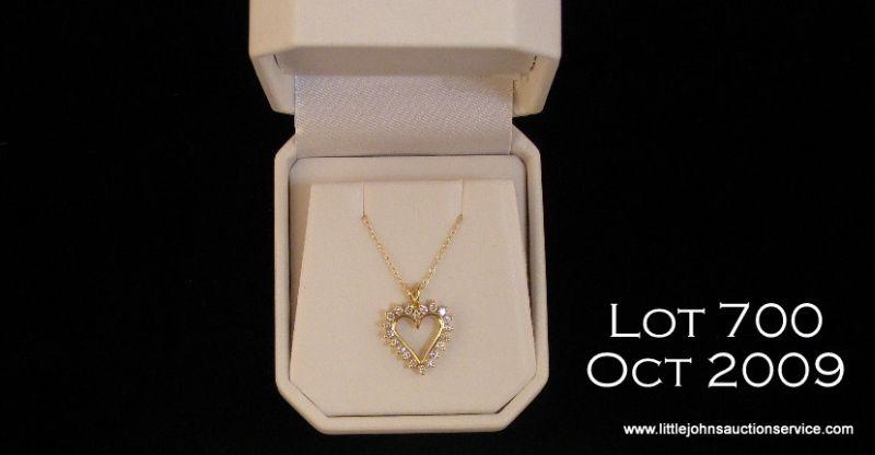Dazzling 14 karat yellow gold ladies heart design necklace set with round diamonds weighing approx. 0.50 carats of H-I color and SI clarity. Retail $1,450.00 Estimate $300-$400
