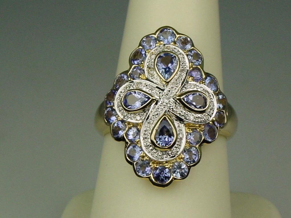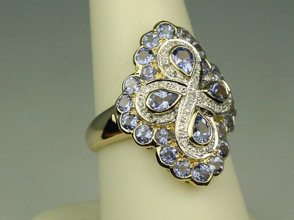 Dazzling 14 karat yellow gold ladies ring bezel set with pear shape and round Tanzanite weighing approx. 3.00 carats and pave set with 26 round diamonds weighing approx. 0.20 carats of F-G colors and VS clarity. Retail$2,000-$2,500 Estimate $1,000-$1,500 Very labor intensive