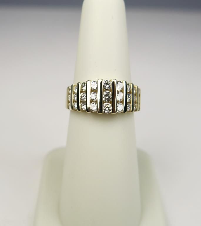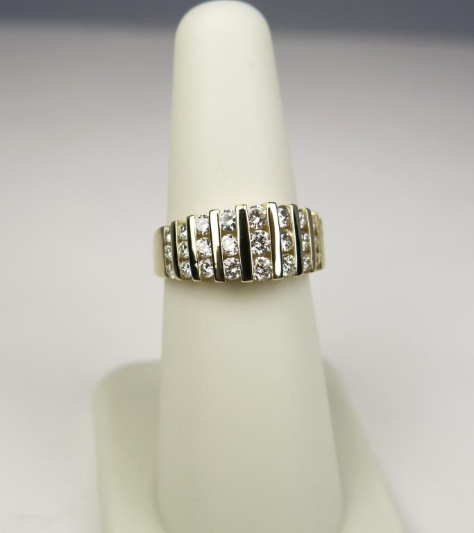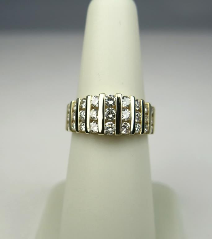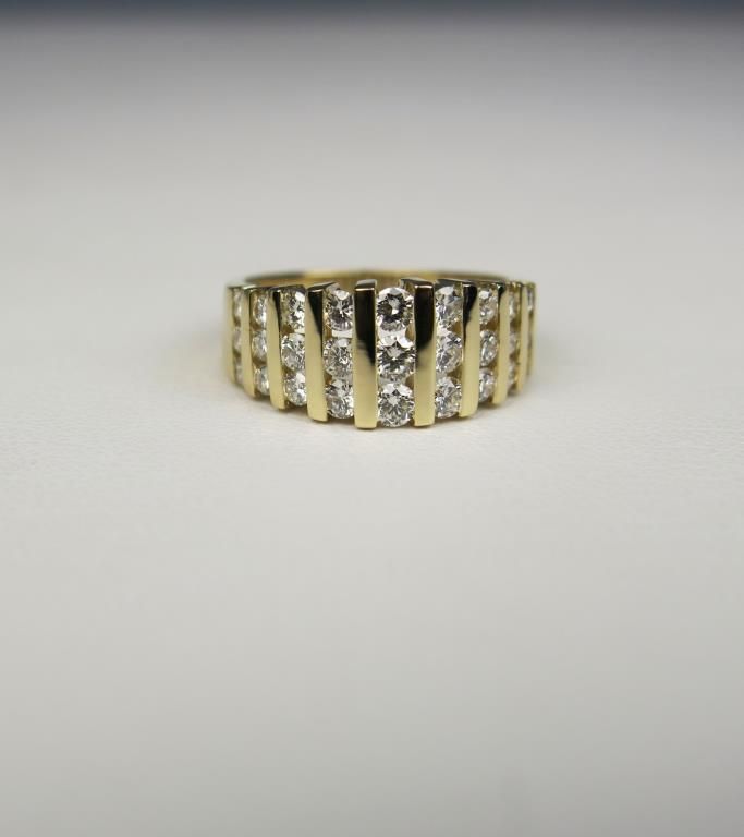 Dazzling 14 karat yellow gold ladies ring channel set with 27 round ‘IDEAL’ cut diamonds weighing approx. 1.00 carat of G-H colors and VVS/VS clarity. Retail $2,000-$2,500 Estimate $1,000-$1,500 Nice