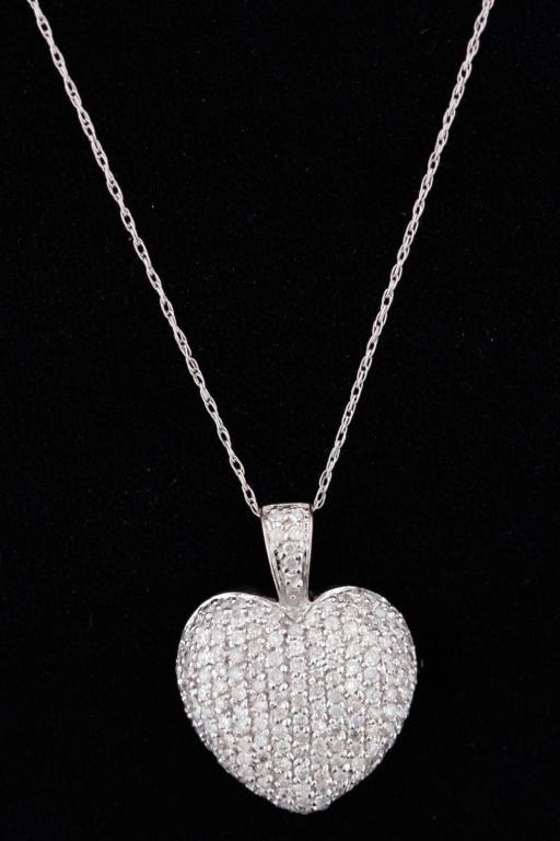 Dazzling 14K White Gold Ladies Pendant Puffed heart design set with over 100 round diamonds weighing approx 1.00-1.50 carats of H-I colors. Retail $2,250.00.