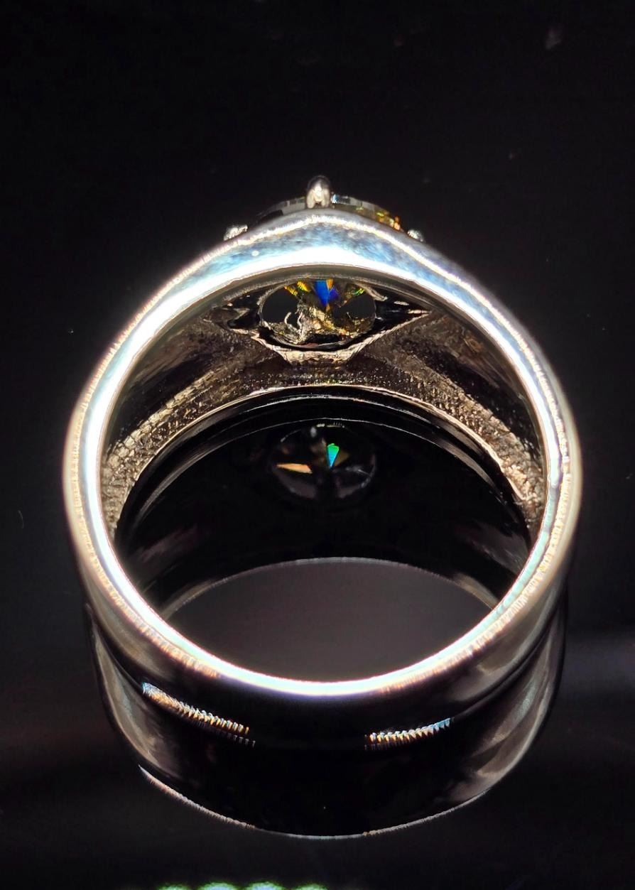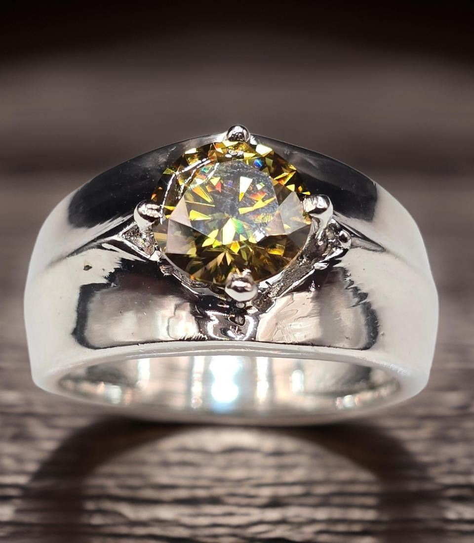 This 2.35 Ct Lab Simulated Diamond Solitaire is a VVs1 Brillant Round Cut Measuring approx..8.mm. The color is a Unique Rich Whiskey Golden Green Amber Color. It is eye clean and bursting out with a full spectrum of colors. It Is Mounted In Tri-Layered 14 Kt White Gold over Solid .925 Sterling Silver which gives this ring its high polish and shine. With a 9.25 to 9.5 rating on the mohs hardness scale this simulated diamond will test positive for a diamond with almost any diamond tester.***It is also earth friendly conflict free***. Ring size 9 The total weight is a stealth 5.5 grams.