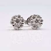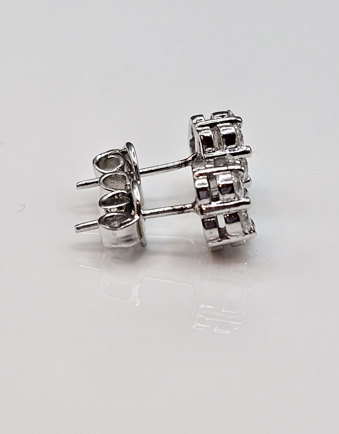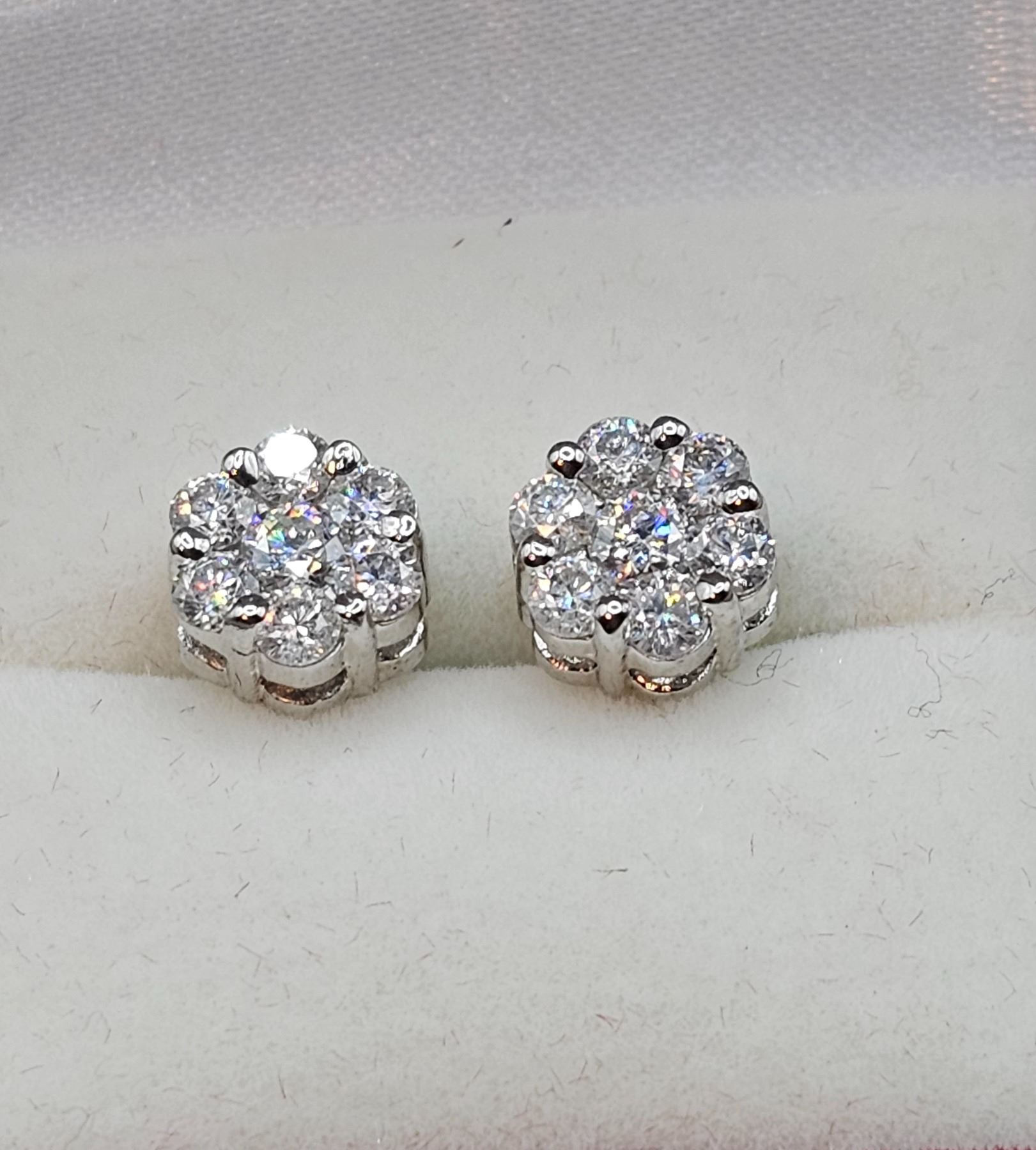 14 Kt White Gold Plated 2.5 Ctw VVs1 White E-F Fire Moissanite Cluster Earrings. These 14 brilliant round moissanites are mounted in 14 Kt Tri-Layered White Gold over Solid Sterling Silver. Remarkable Brilliance and Sparkle!!! With a refractive index of 2.65-2.69, these moissanites exhibit more fire and brilliance than a natural diamond. The total weight is 2.5 grams.
