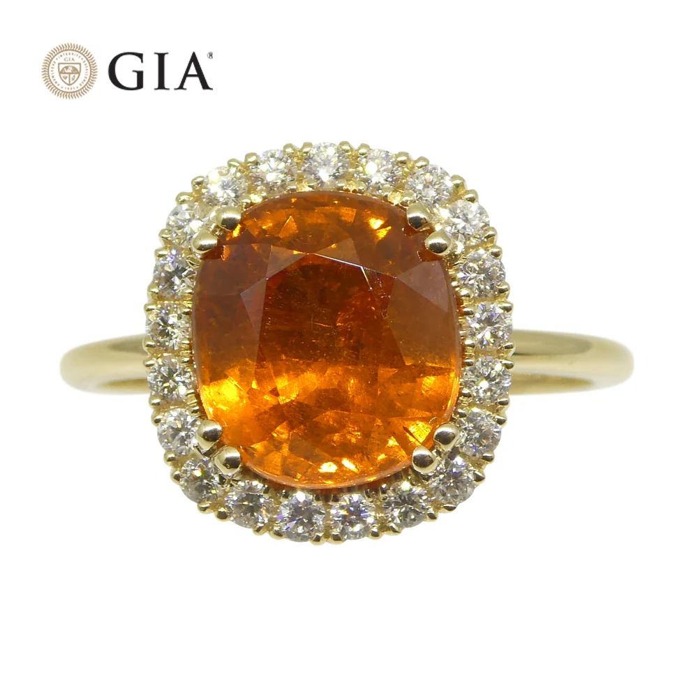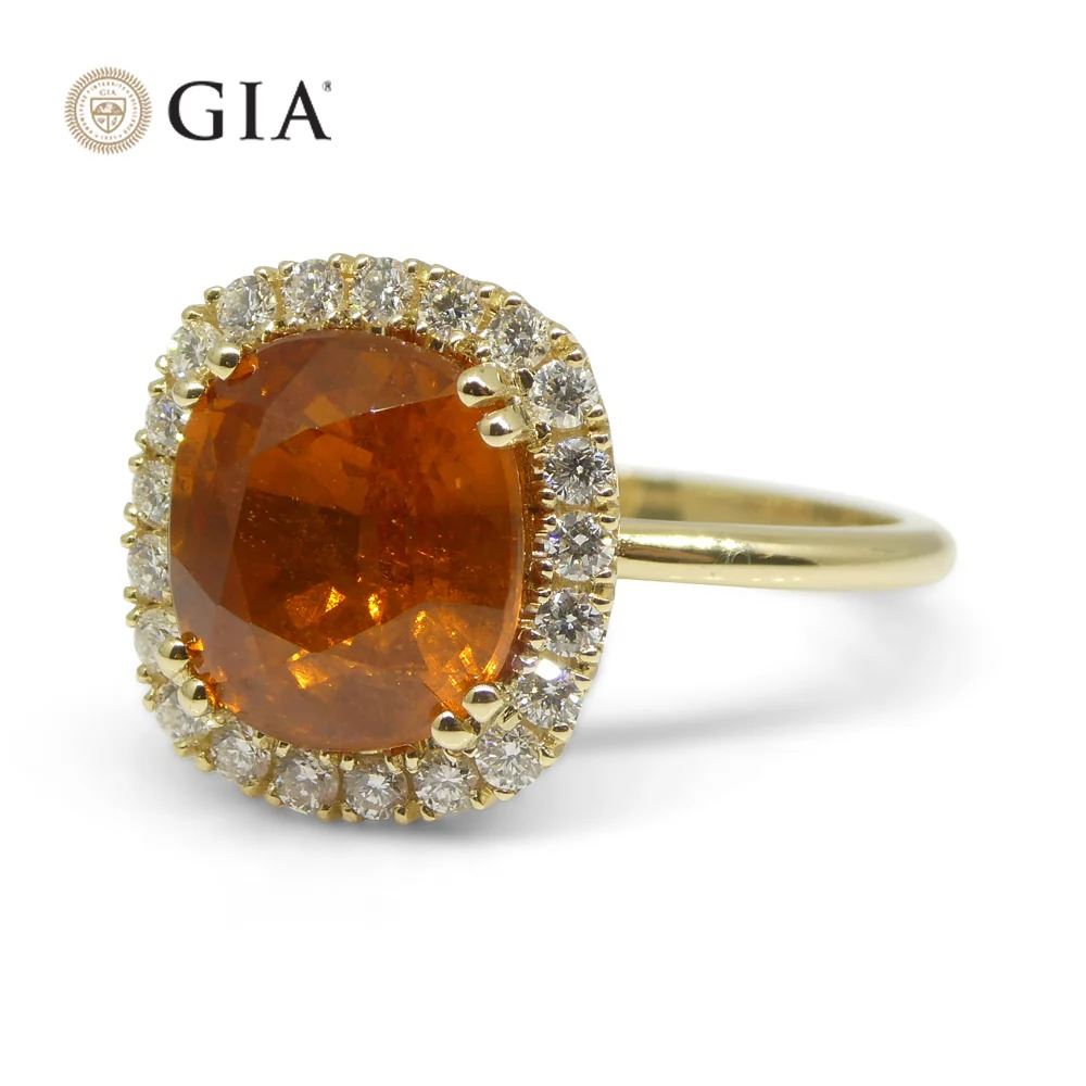 Stunning 4.23 Ct Orange Spessartine Garnet Ring with a brilliant cushion cut and measuring at 9.30 x 8.36 x 5.60 mm. Complemented with 21 diamond accent stones and set in 14k yellow gold. Total weight of item: 3.68g. The ring is currently a size 7.25, it can be resized for free after purchase. Treatment: None. Please see certification for additional information.