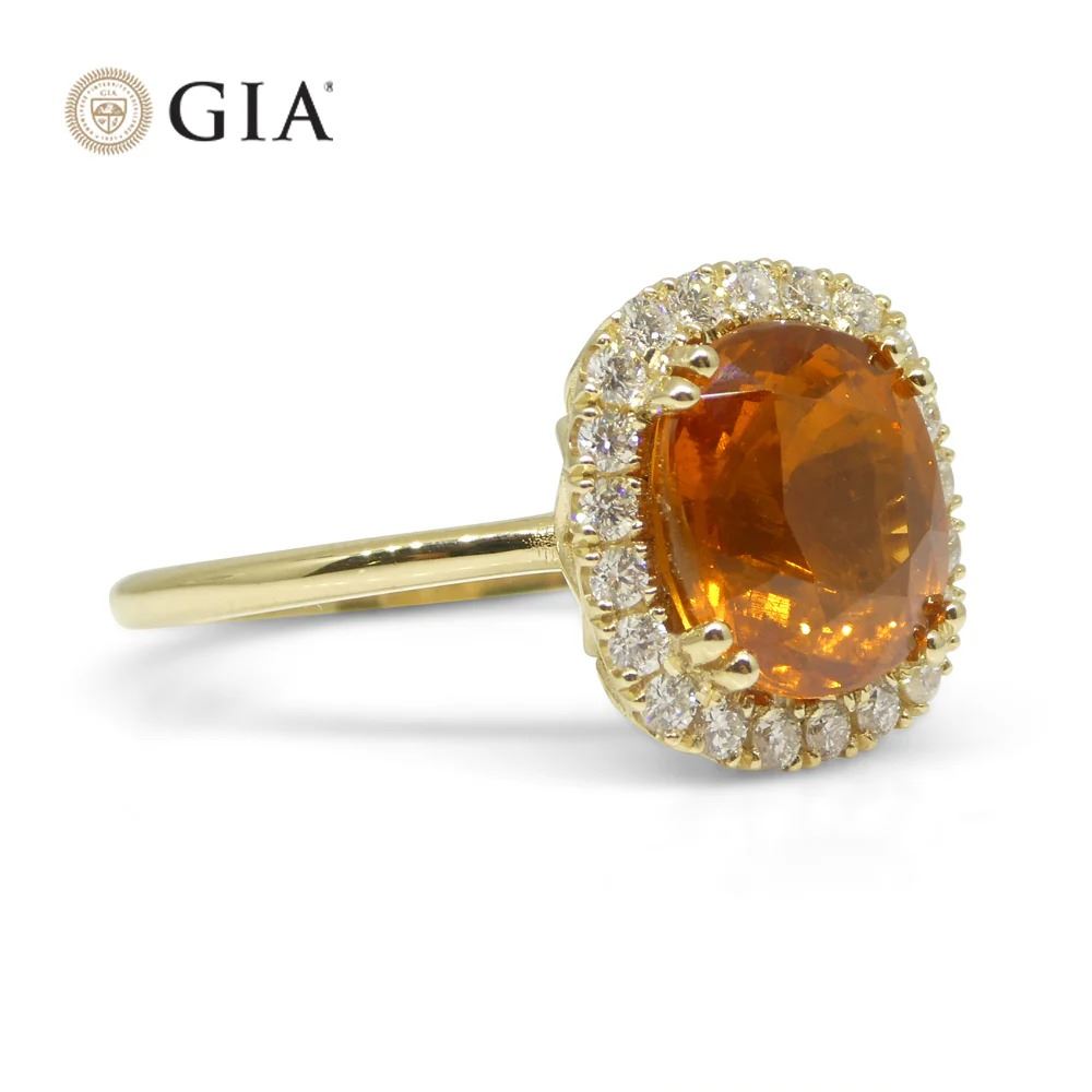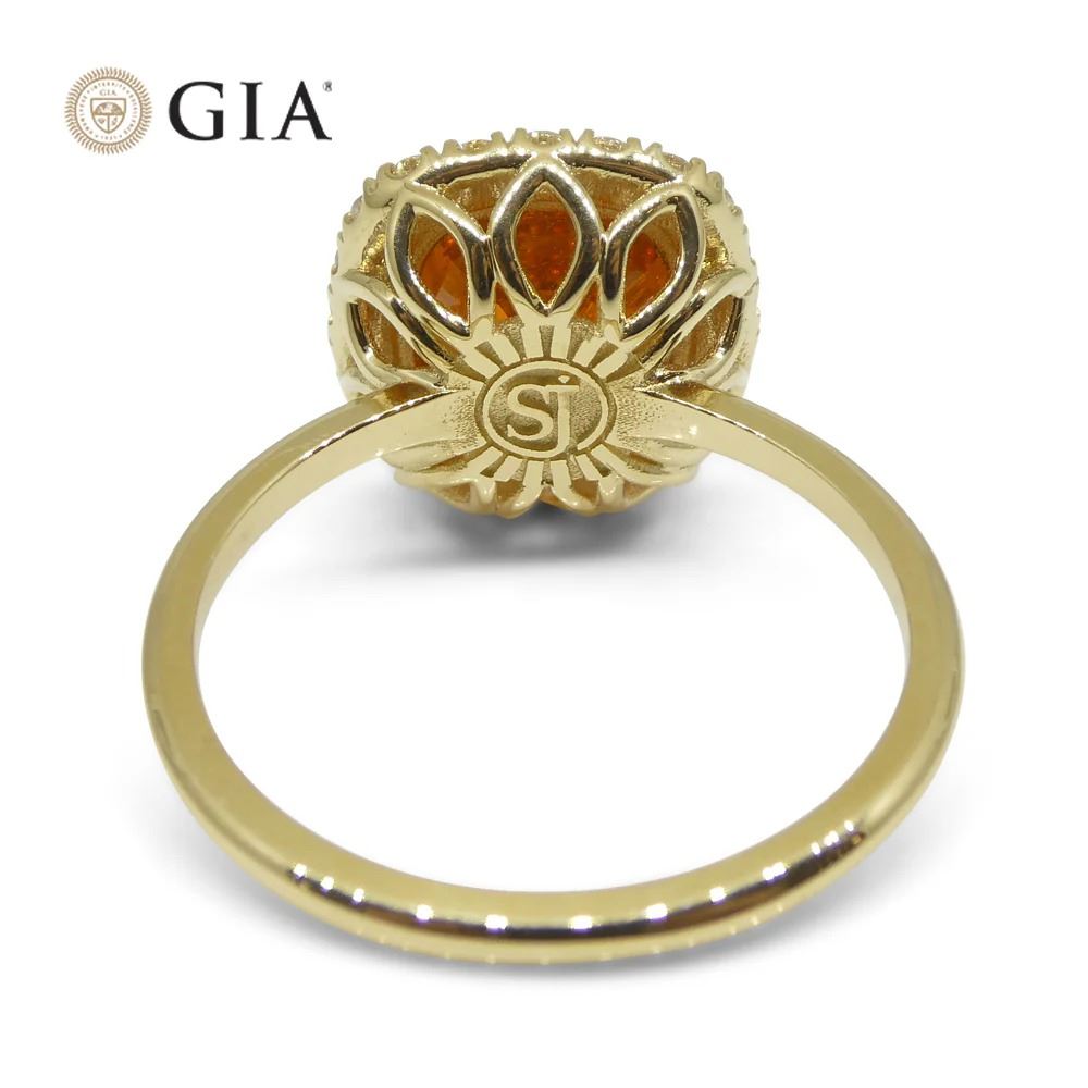 Stunning 4.23 Ct Orange Spessartine Garnet Ring with a brilliant cushion cut and measuring at 9.30 x 8.36 x 5.60 mm. Complemented with 21 diamond accent stones and set in 14k yellow gold. Total weight of item: 3.68g. The ring is currently a size 7.25, it can be resized for free after purchase. Treatment: None. Please see certification for additional information.