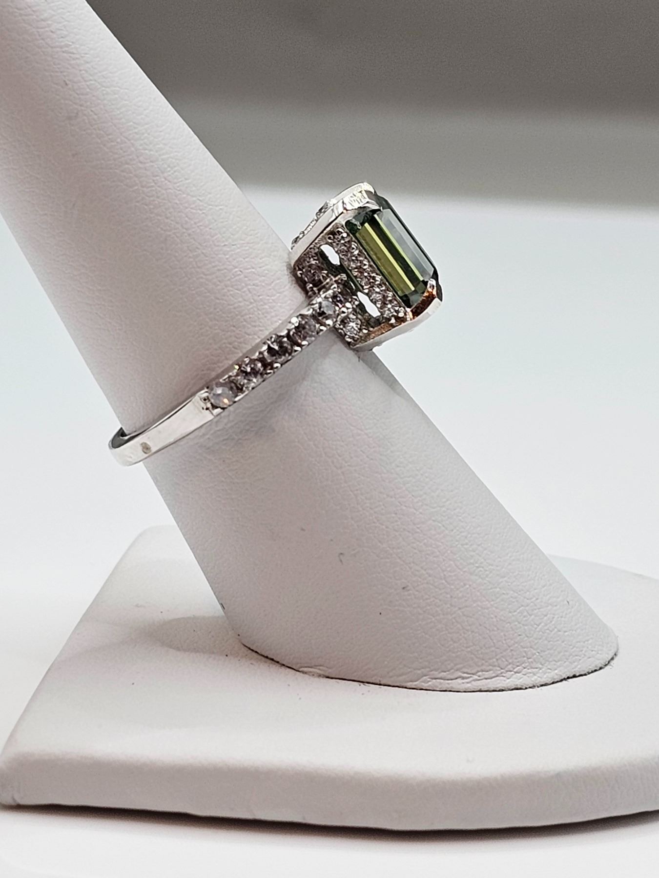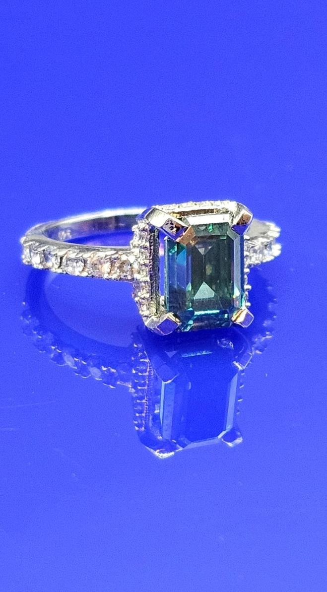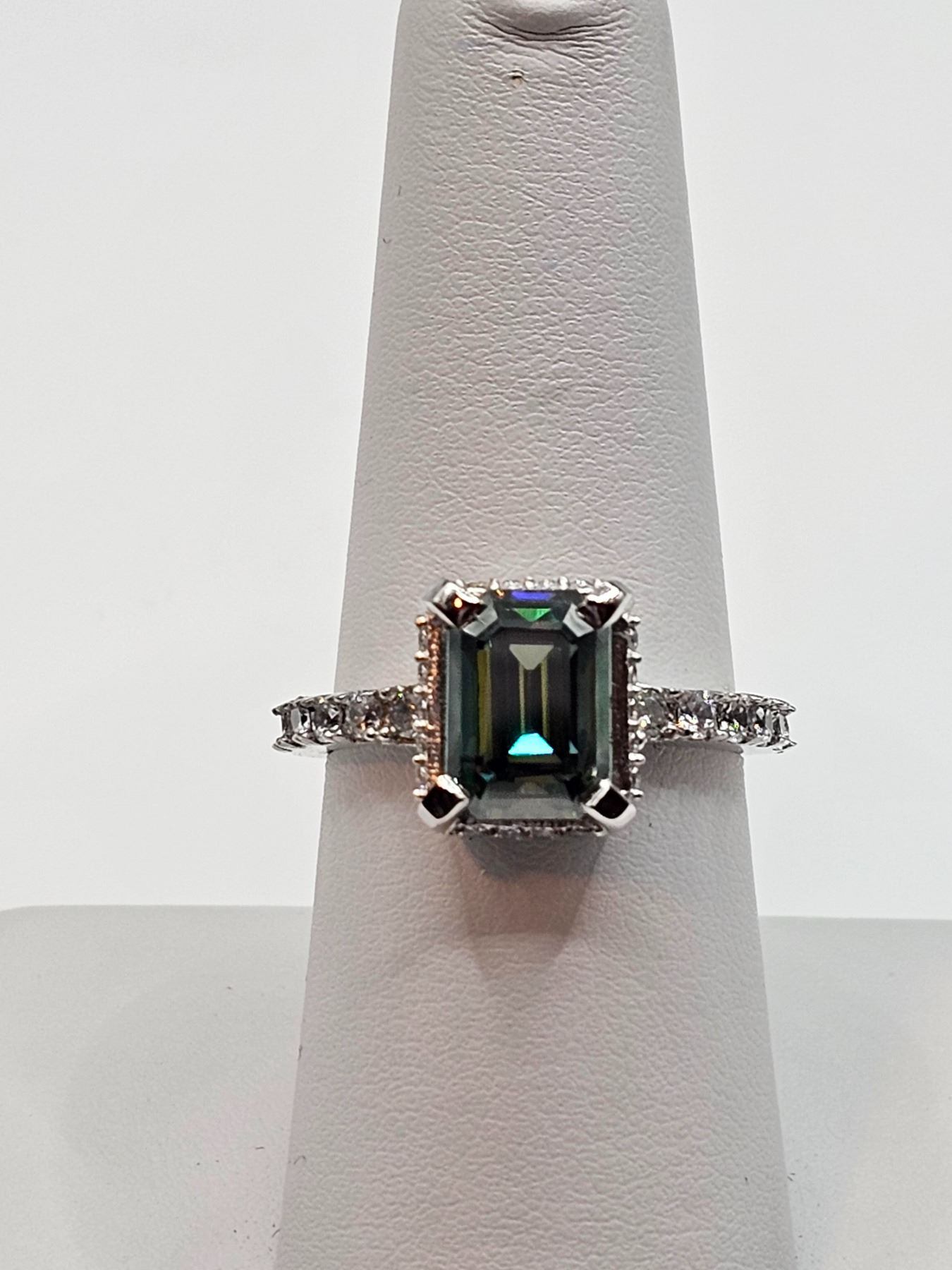 This Moissanite is a 4.5 Ct Emerald Cut Measuring 9 x 7.5 mm. The Color is Deep Emerald Green. The Clarity is VVs1 . It is mounted in 14 Kt White Gold over solid .925 sterling silver. With a refractive index of 2.65-2.69, this Moissanite exhibits more brilliance than a natural diamond thanks to a dispersion that is 2.4 times higher. It is also conflict free and earth friendly. This exceptional Moissanite measures 9.25 on the mohs hardness scale and will test positive for a diamond with almost any diamond tester. Total weight of this ring is 3.2 grams. Ring size 7.5 This ring is Gorgeous! Don't miss it.