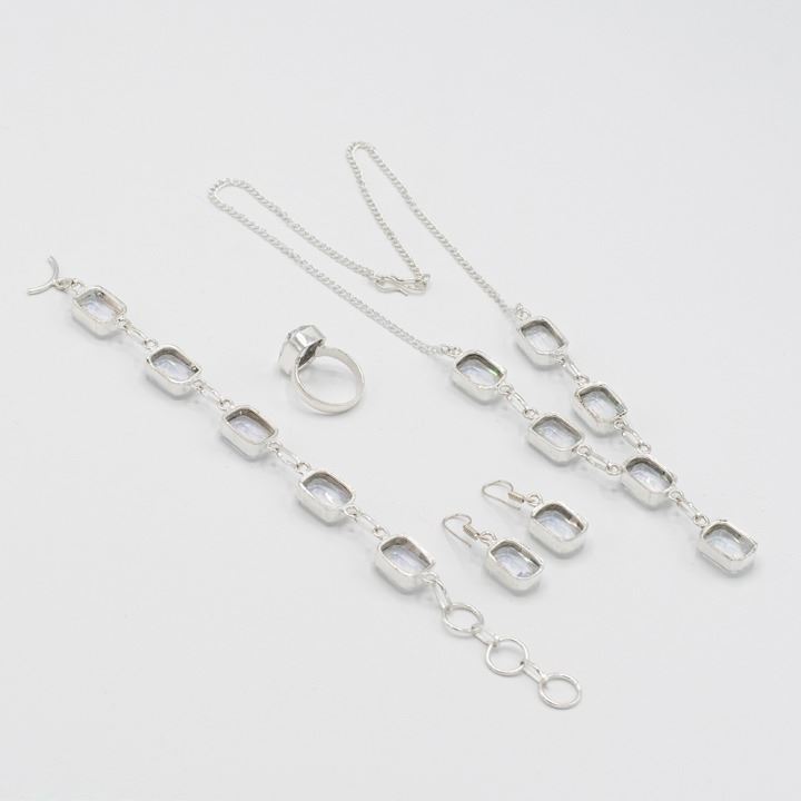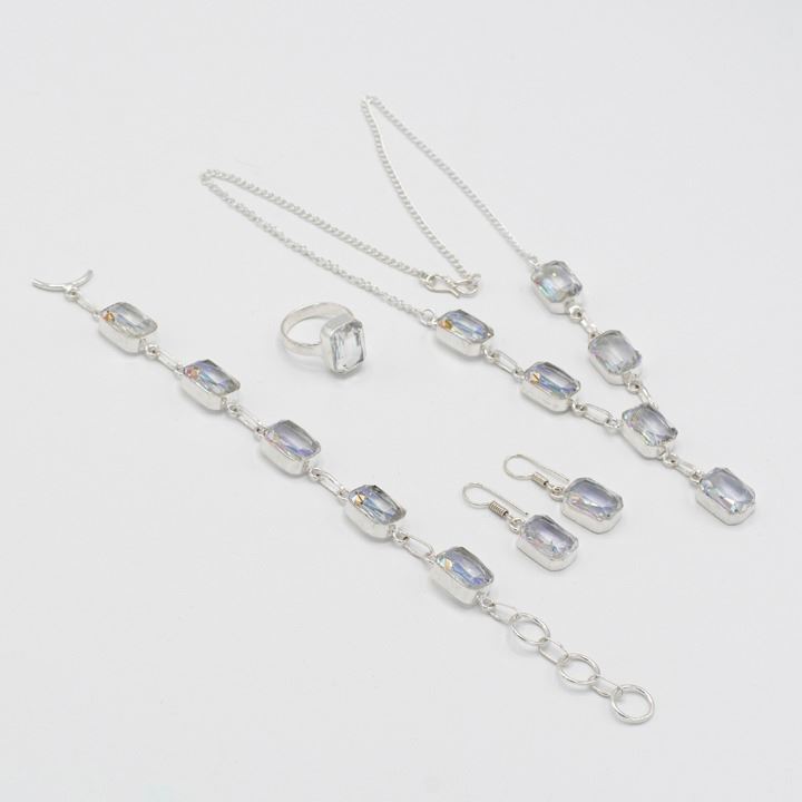 Dazzling 4 Piece Azotic Topaz Jewelry Set. These lab made gemstones are near flawless. They burst out with a dazzling sparkle and vivid even tone. The 4 piece set includes an 18" 35 cttw azotic topaz necklace, bracelet, earrings and finger ring size 6.5 . Mounted in .925 sterling silver overlay. Gram total weight is approximately 40 grams or for all 4 pieces.