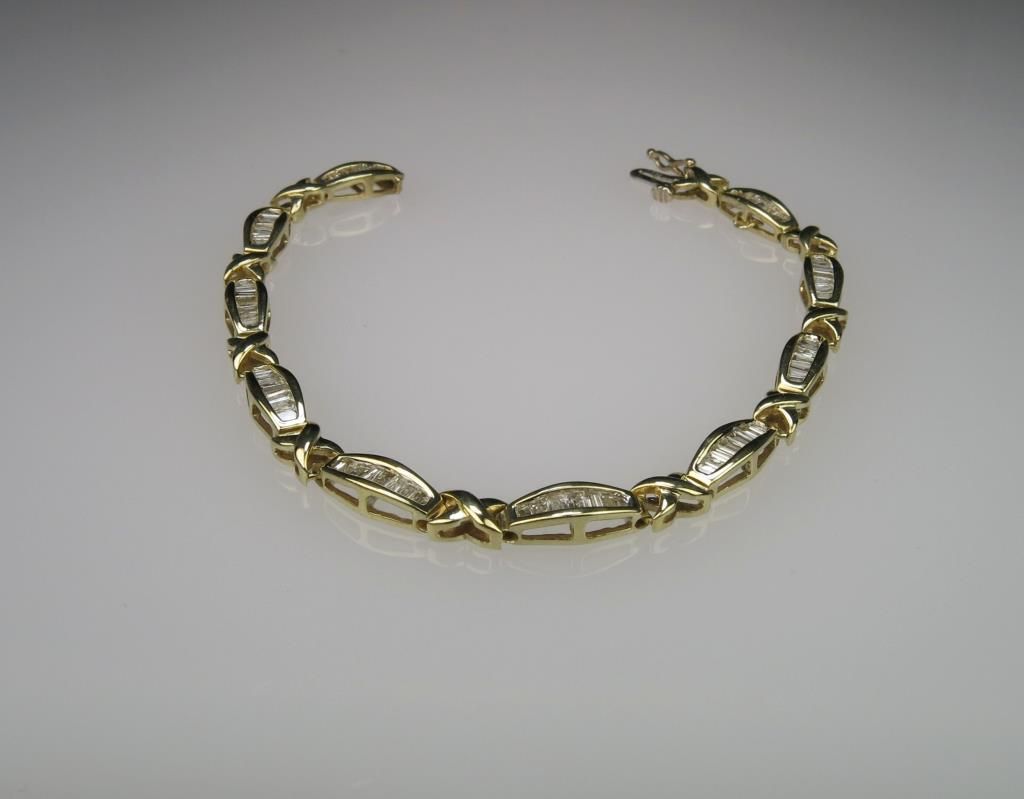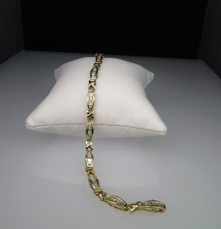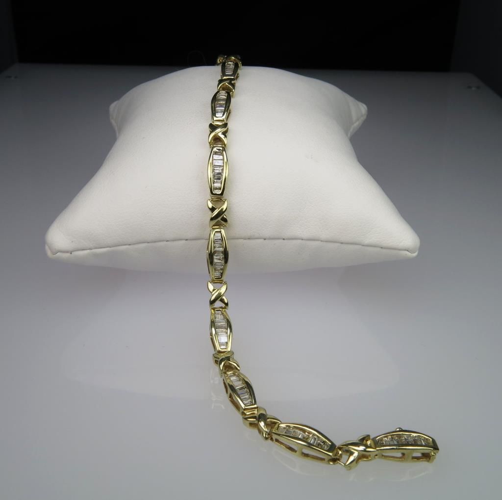 Dazzling Baguette cut Diamond Bracelet with 80 channel set baguette cut Diamonds weighing approx. 3.00 carats with H-I colors and SI clarity set in 10 karat yellow gold. Retail $2,000-$3,000 Estimate $1,500-$2,000