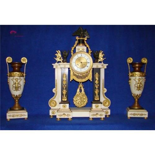 SIMPLY EXQUISITE!!! JUST TAKE A MOMENT TO TAKE IN THE BEAUTY OF THIS FABULOUS ANTIQUE EMPIRE CLOCK SET!!We are offering for sale this unique antique Empire clock set recently acquired from a France estate in the South of France near Cannes.This is the most wonderful clock set you will ever find!The clock and side pieces are made of the finest Carrara marble decorated with gorgeous bronze gilt ornaments.The style of this gorgeous clock set is Empire and the age is about 1870.The clockwork is stamped with: "V.M.B.".The bronze gilt ornaments are fantastic with on top of the clock a bronze eagle and two Sphinx which have a beautiful dark brown patina.If you are looking for an unique clock set for your exculusive collection, or a very special clock set that no one other can buy at any time this is the right clock set for you!!Perfect running and striking condition with 8 days going work and the 1/1 and 1/2 hours striking on a silvered bell.The dimensions are:Clock:Heigth: 22 Inches,Width: 15 Inches and Depth: 5 Inches.Sidepieces: Height: 15 Inches,Width: 5 Inches and Depth: 4 Inches.Regarding shipping we will pack the clock set in a wooden box so you will receive it without any damage. Because the clock set is that big and heavy the shipping costs will be 300 US$.After payment you will receive the clock set in about 4 or 5 days.This is a very uniques clock set for the collector or someone wanting an unusual clock set that no one else has!!Thank you for looking this marvelous clock ...