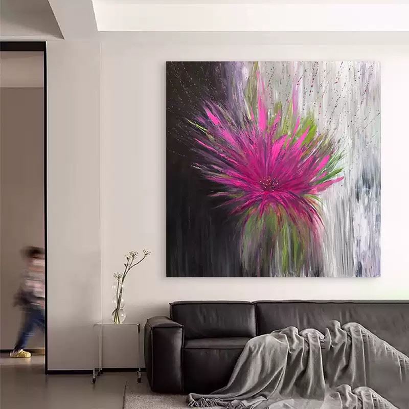 In this painting, a vivid magenta bloom bursts forth at the border of black and white, its petals shooting out like rays of light. The stark contrast with the cool background makes it feel like a fleeting, dazzling flash cutting through the darkness. Dimensions: 24 x 24 inches.