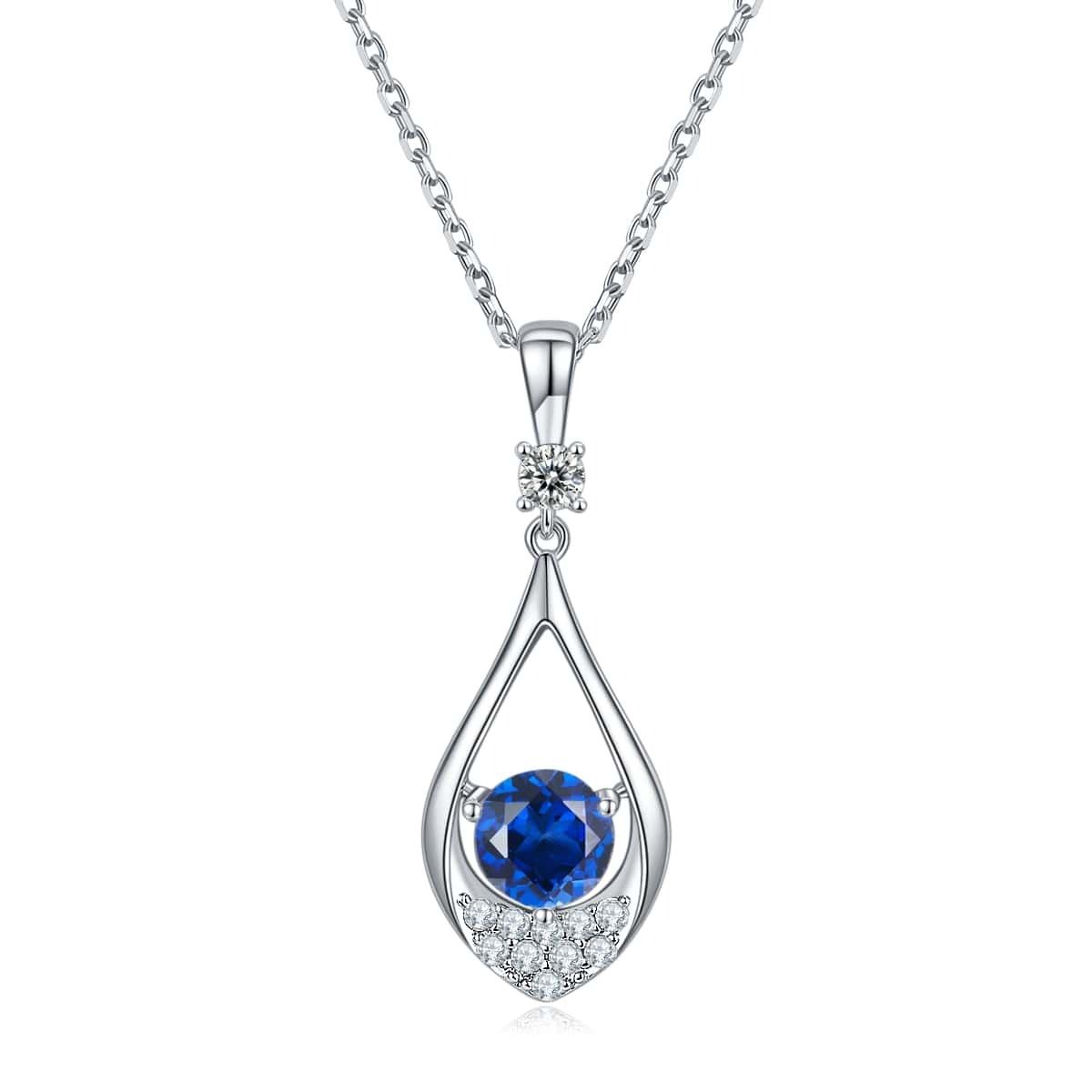 Ladies Lab Created Sri Lanka Blue Sapphire Pendant. This Blue Sapphire Pendant is a near flawless 1 ct brilliant round cut. Mounted in .925 solid sterling silver. It is complimented by 14 Kt White Gold Overlay, which gives the pendant its high polish and shine. It is also tarnish resistant. The total weight is approx. 1.7 grams including an 18" chain.