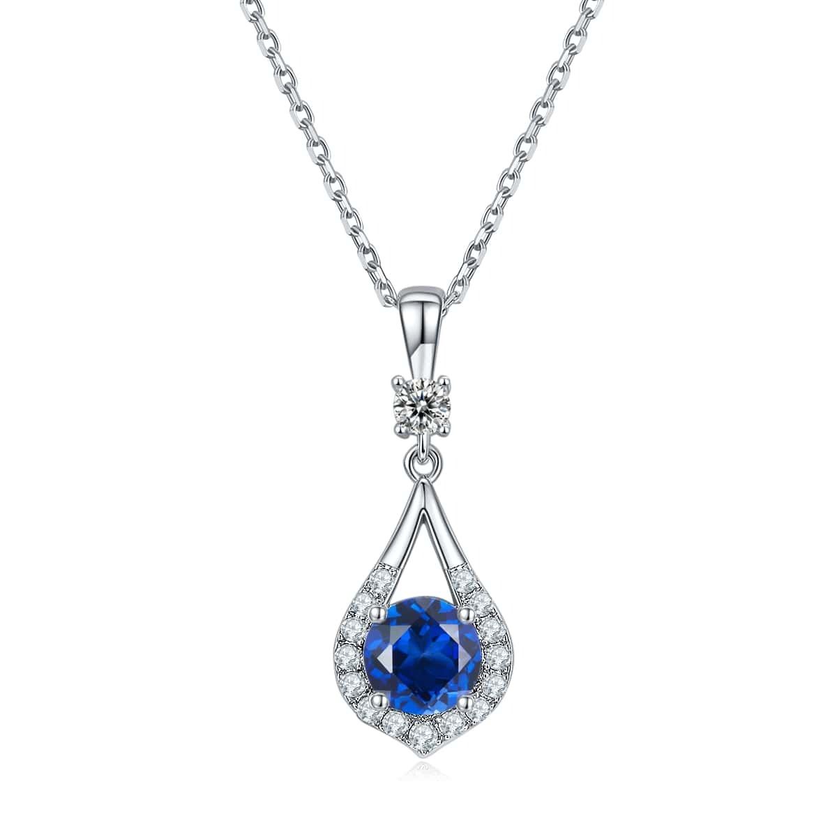 Ladies Lab Created Sri Lanka Blue Sapphire Pendant. This Blue Sapphire Pendant is a near flawless 1 ct brilliant round cut. Mounted in .925 solid sterling silver. It is complimented by 14 Kt White Gold Overlay, which gives the pendant its high polish and shine. The total weight is approx. 1.7 grams including an 18" silver chain.