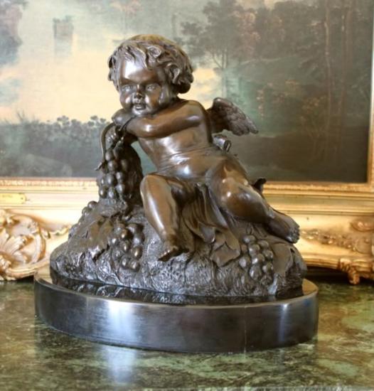 Cupid Cherub Bronze Sculpture, After N. Muller No. 25 - 13"H x 12"L x 8"D 25lbs. This bronze sculpture was produced using the "Lost Wax" casting method. The"Lost Wax" Cast method is the most precise metal casting technique in existence, ensuring exquisite detail of the original host model which is usually sculpted in clay or wax. This "Lost Wax" casting method is an extremely labor intensive and expensive process, but the end results produce a Heirloom Quality Masterpiece! A cherub is a form of angel mentioned several times in the Bible. In modern English the word is usually used for what are strictly putti, baby or toddler angels in art. This article is concerned with the original sense of the word.Cherubs are described as winged beings. The biblical prophet Ezekiel describes the cherubim as a tetrad of living creatures, each having four faces: of a lion, an ox, an eagle, and a man. They are said to have the stature and hands of a man, the feet of a calf, and four wings. Two of the wings extended upward, meeting above and sustaining the throne of God; while the other two stretched downward and covered the creatures themselves.