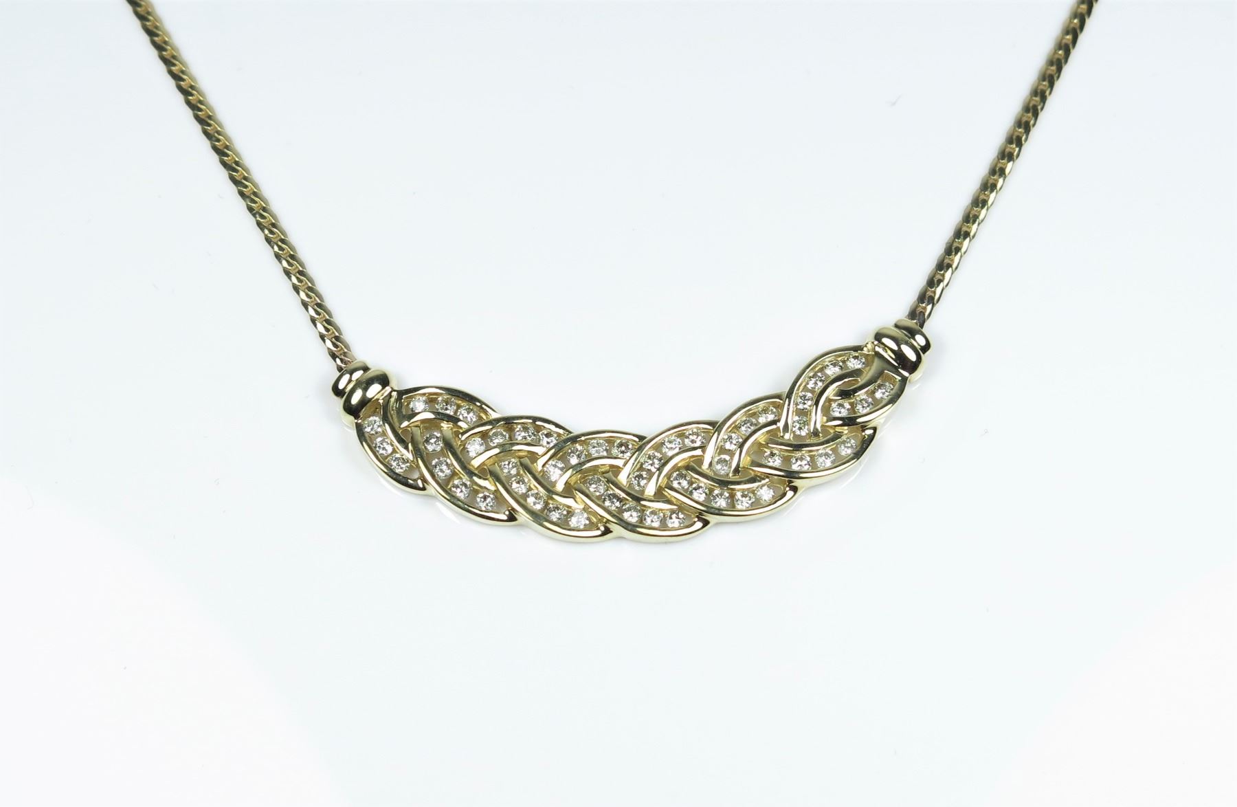 Dazzling Custom Diamond Necklace featuring 54 channel set ‘IDEAL’ cut Diamonds weighing approx. 1.50 carats with H-I colors and VS/SI clarity set in a 14 karat yellow gold braided design setting. Retail $3,000-$4,000Estimates $2,000-$3,000
