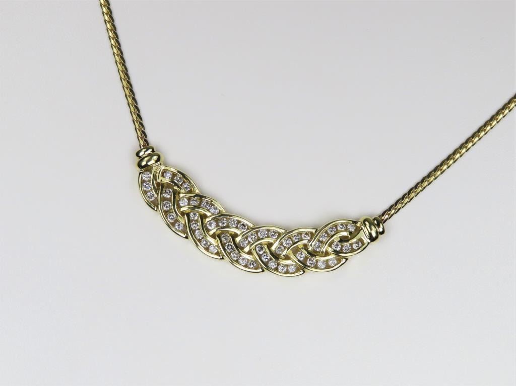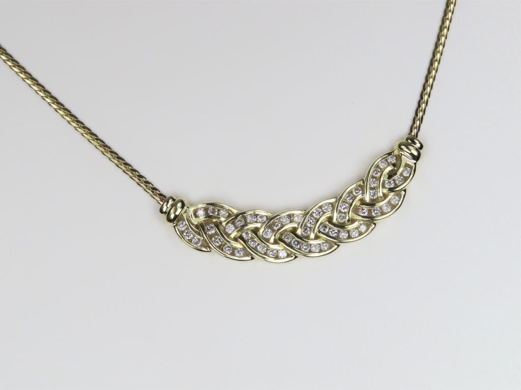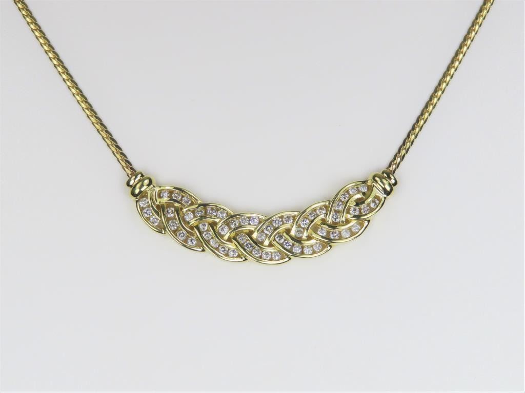 featuring a Braided Design with 54 channel set ‘IDEAL’ Diamonds weighing approx. 1.50 carats total with H-I colors and VS/SI clarity set in a 14 karat yellow gold setting.