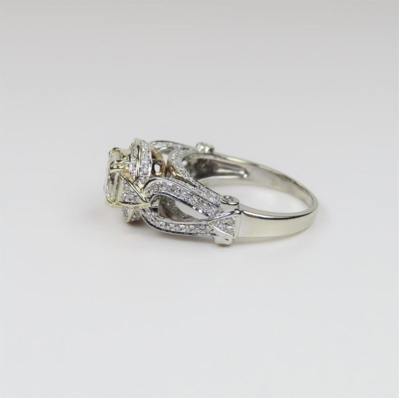 featuring a round center Diamond weighing 1.01 carats with H-I colors and SI clarity micro set with over 144 round Diamonds weighing approx. 1.10 carats with G-H colors and VS clarity set in 18 karat two-tone gold custom crafted setting. Would Appraise between $10,000-$12,000