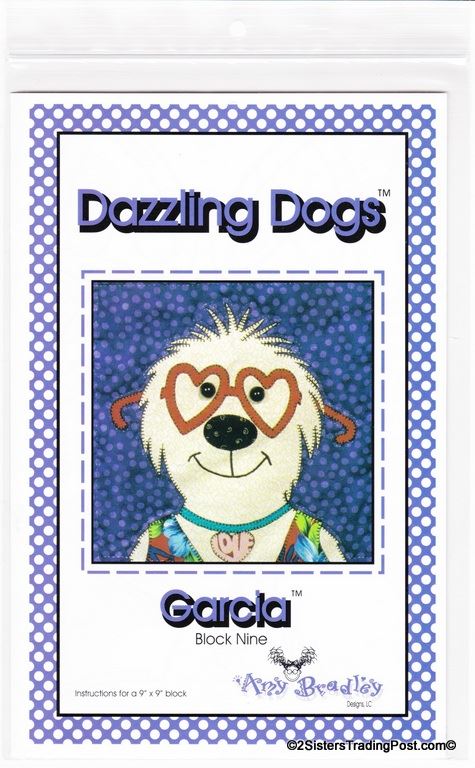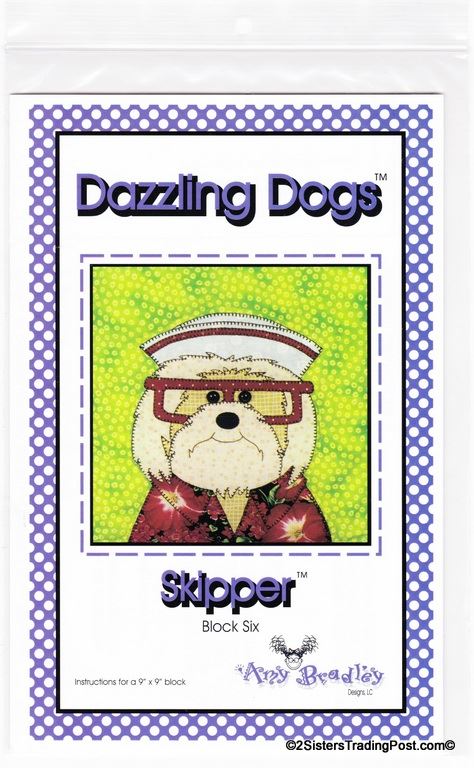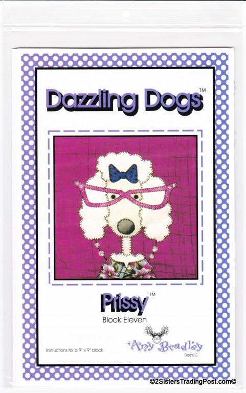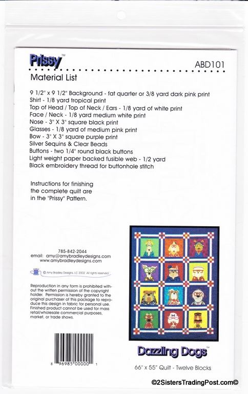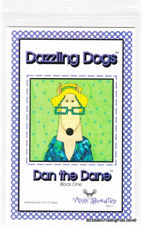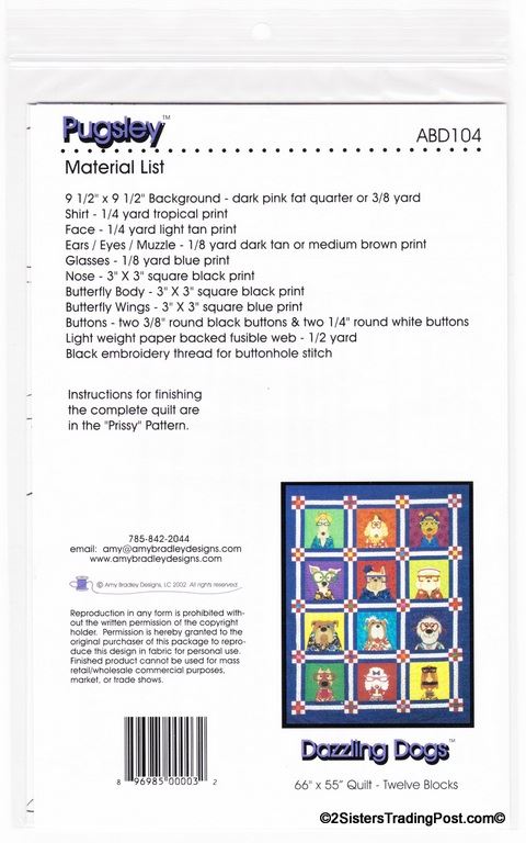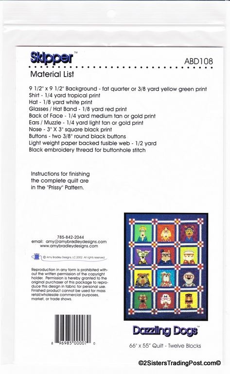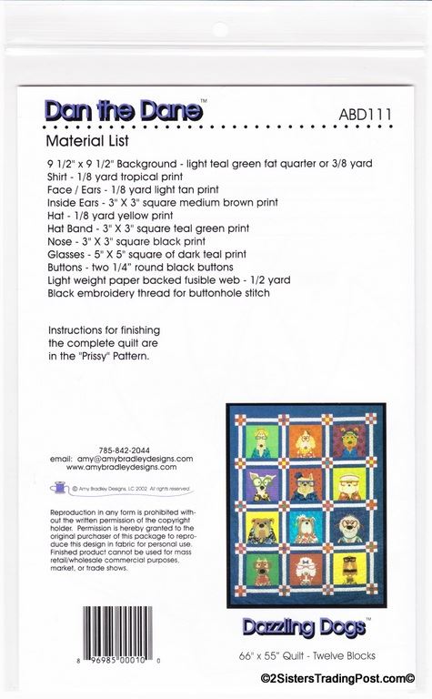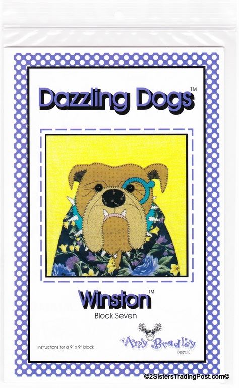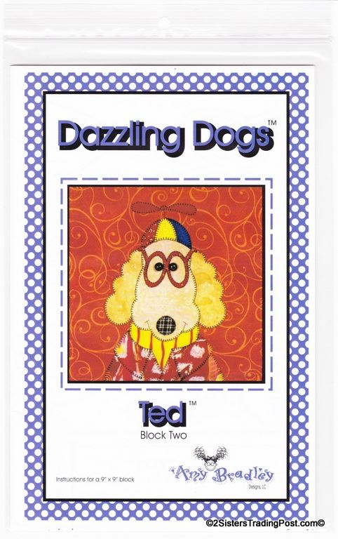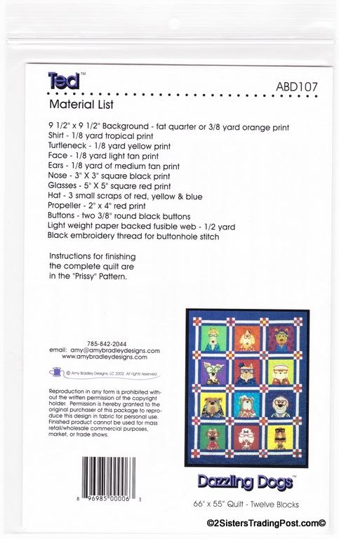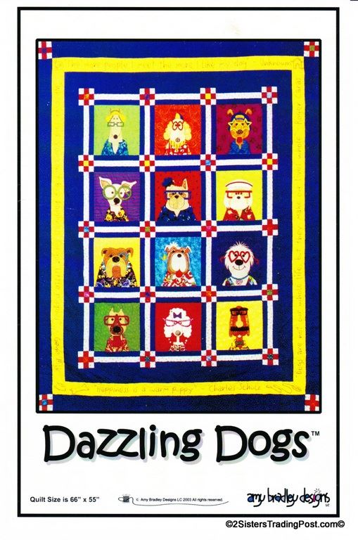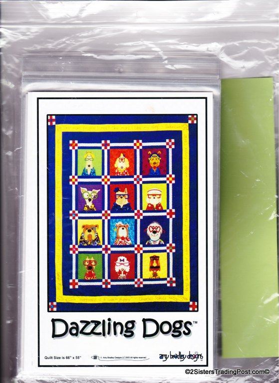 This is for the entire set of 12 patterns of 'Dazzling Dogs' quilt by Amy Bradley. Also included are the instructions for finishing the complete quilt included with block 11 pattern. Included block1 Dan the Dane, block 2 Ted, block 3 Frankie, block 4 T.C., block 5 Pugsley, block 6 Skipper, block 7 Winston, block 8 Ralph, block 9 Garcia, block 10 Major, block 11 Prissy (also includes quilt assembly instruction) & block 12 Groucho. Each block makes a 9" x 9" square finished quilt 66" x 55" All are uncut new in individual bags. MSRP $30.00