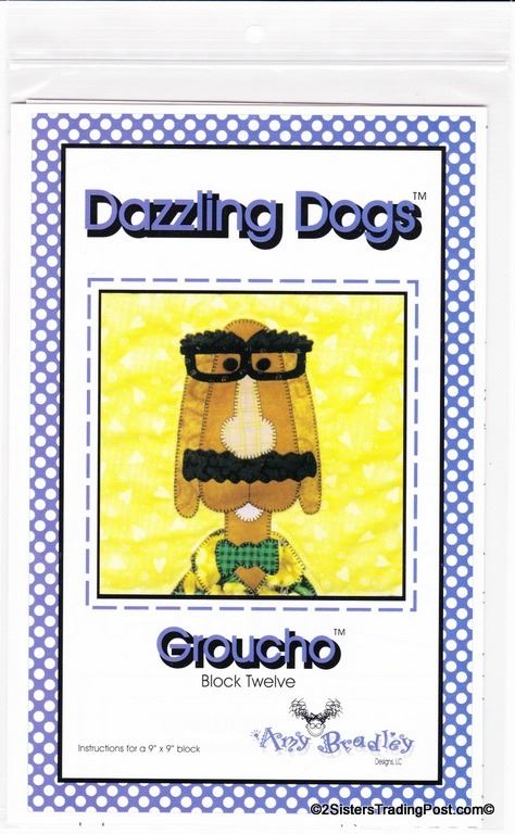 This is for the entire set of 12 patterns of 'Dazzling Dogs' quilt by Amy Bradley. Also included are the instructions for finishing the complete quilt included with block 11 pattern. Included block1 Dan the Dane, block 2 Ted, block 3 Frankie, block 4 T.C., block 5 Pugsley, block 6 Skipper, block 7 Winston, block 8 Ralph, block 9 Garcia, block 10 Major, block 11 Prissy (also includes quilt assembly instruction) & block 12 Groucho. Each block makes a 9" x 9" square finished quilt 66" x 55" All are uncut new in individual bags. MSRP $30.00