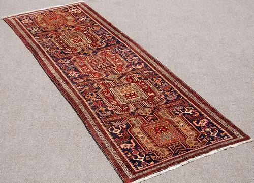 Beautiful hand woven semi antique Persian Meshgin. Size 3.5 x 10.3 feet, made of fine quality baby lamb's wool pile on cotton foundation, all natural vegetable dye, the weaver utilized a very rare and unique looking design, incorporates allover geometric motifs pattern on a navy blue background with a row of five large medallions, contrasted beautifully with a light and red toned intricate done floral multi layered border. Hand woven in Meshgin, Iran.