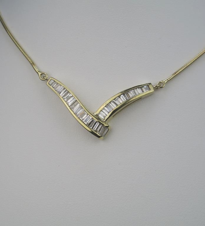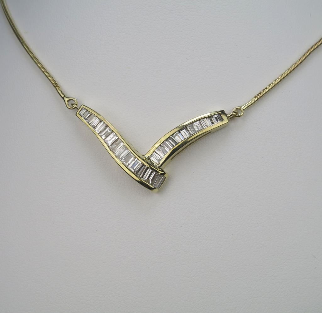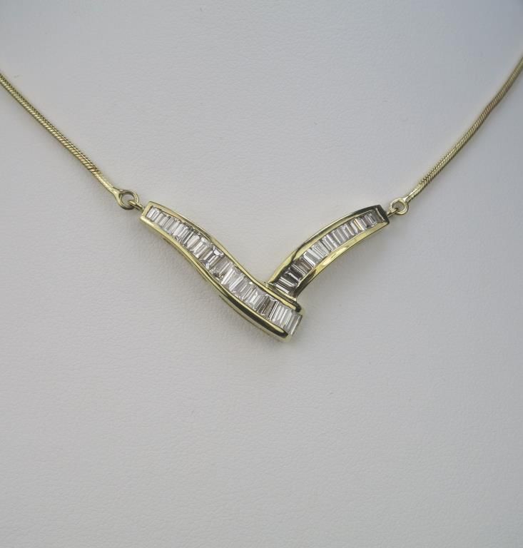 Dazzling High Quality Diamond Necklace with 25 brilliant baguette cut channel set Diamonds weighing approx. 2.00 carats with excellent E-F-G colors and mostly VS clarity set in 10.30 grams of 14 karat yellow gold. FINE Quality Piece.Retail $4,000-$5,000 Estimate $2,500-$3,000.