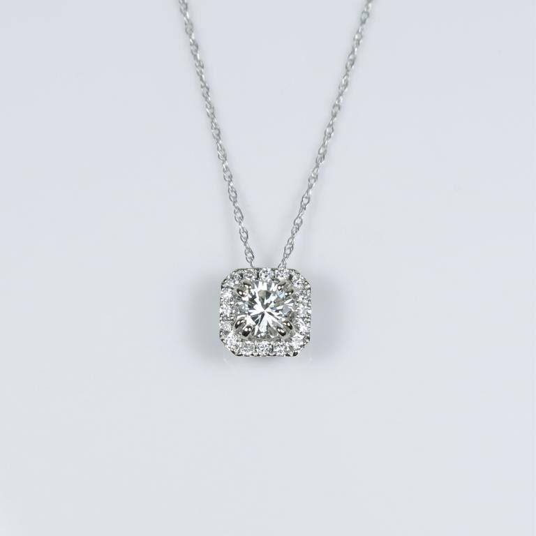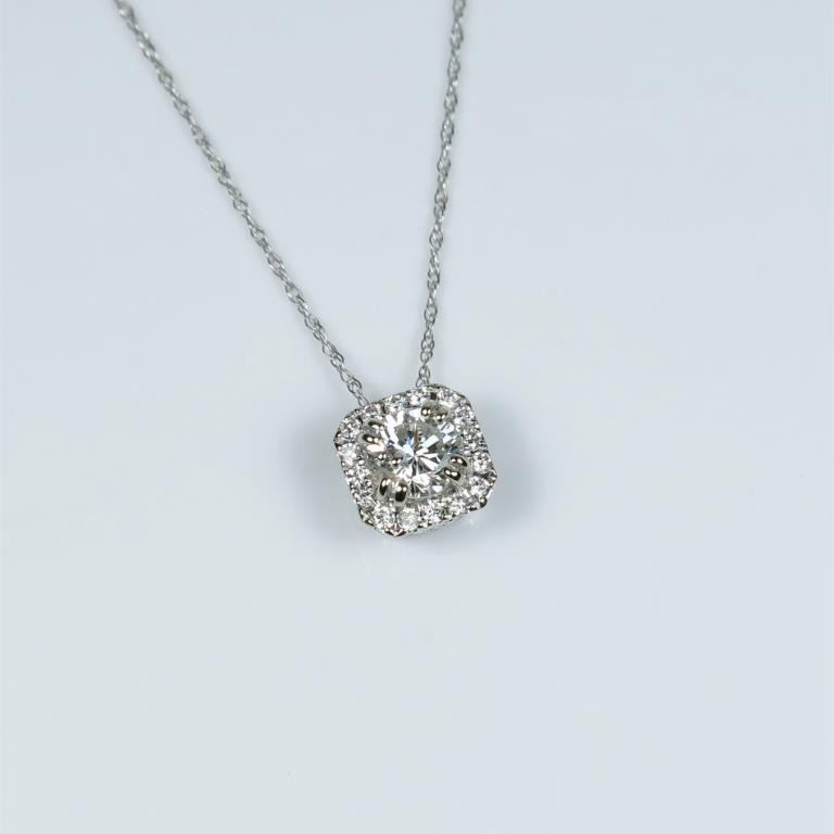Dazzling NEW Diamond Pendant featuring a 0.60 carat ‘IDEAL’ cut Diamond surrounded by 18 round cut Diamonds weighing approx. 0.30 carats with G-H colors VS clarity set in 18 karat white gold setting. Retail$5,000-$6,000 Estimates $2,000-$3,000