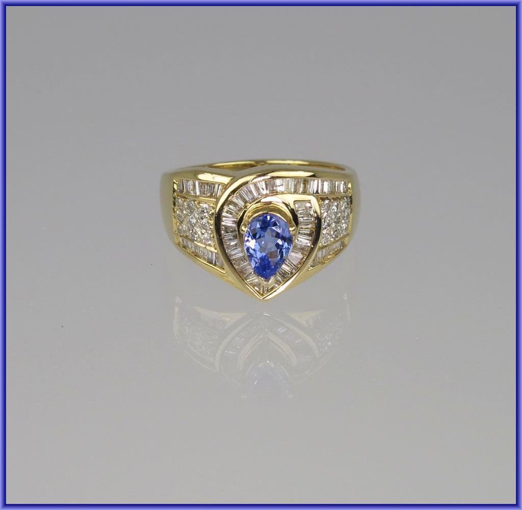 Dazzling Pear Shaped Tanzanite and Diamond Ring featuring an approx. 0.75 carat tanzanite with 84 baguette and round cut Diamonds weighing approx. 2.00 carats total with H-I colors and SI/I clarity set in 7.5 grams of 14 karat yellow gold. Retail $2,000-$3,000 Estimate $1,500-$2,000