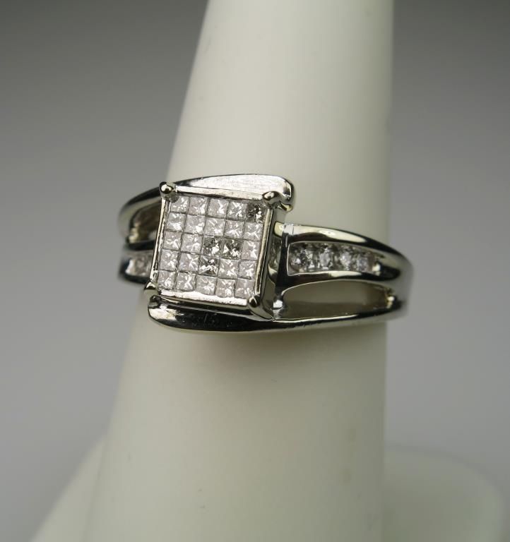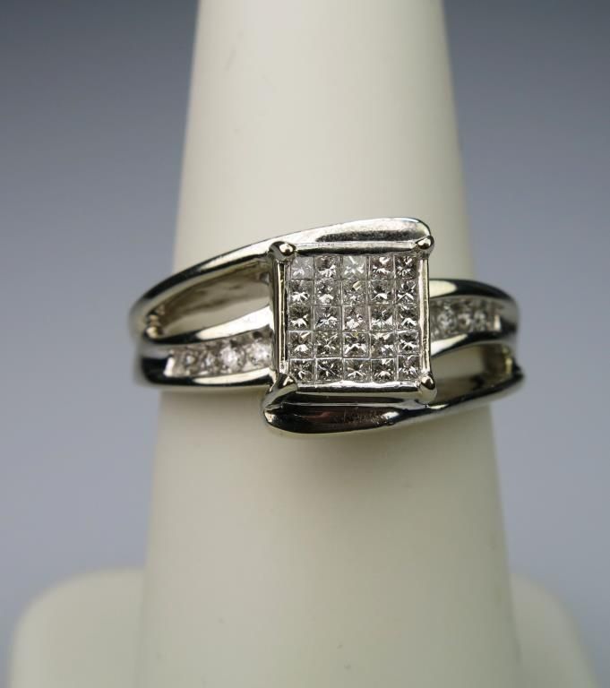 Dazzling Princess cut Diamond Ring with 25 invisible set and 8 round channel set Diamonds with G-H colors and VS clarity weighing approx. 0.75 carat total set in 10 karat white gold. Retail $1,000-$1,500 Estimate $600-$800 VeryLabor intensive.