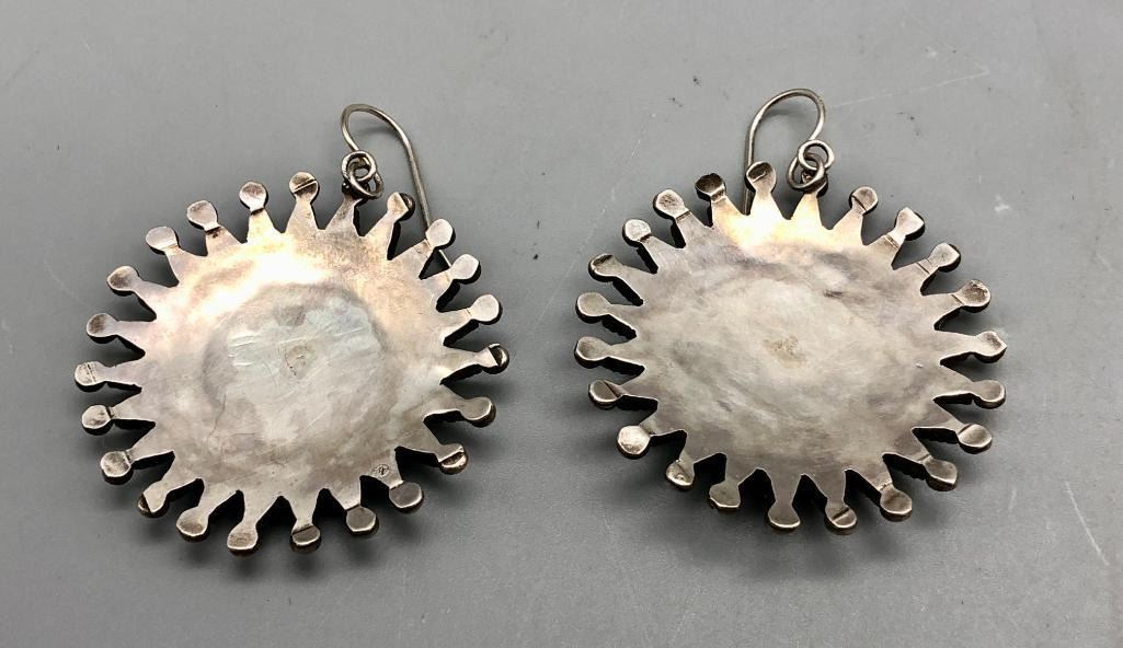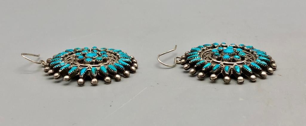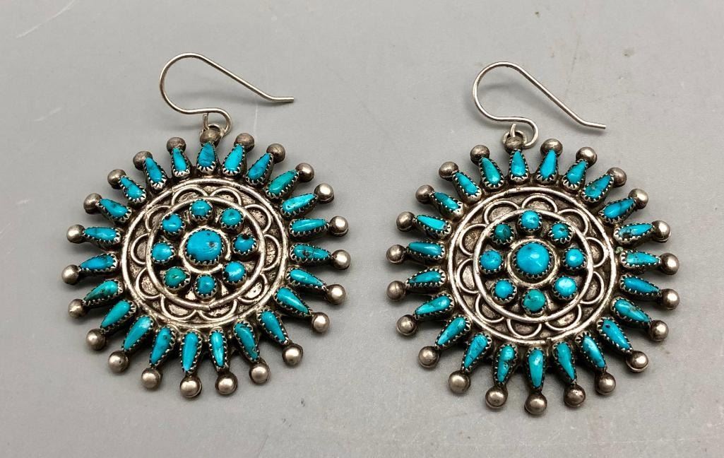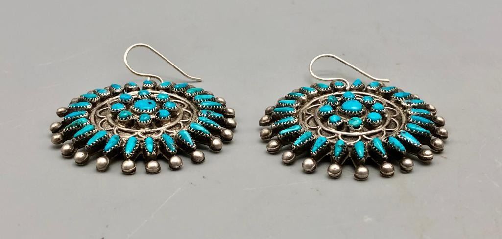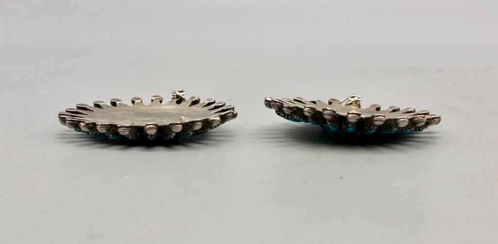 Presented for sale in this lot is a dazzling vintage pair of turquoise cluster earrings. These are a fine pair set with petit point and dot cut turquoise stones. They have fine silverwork between the rows and are made from sterling silver. MAKER: Unmarked. APPROX AGE: Vintage. SIZE: 1-7/8 inches wide X 1-7/8 inches tall. Weighs 23.9 grams. CONDITION: Good for their age, normal wear expected. Please look closely at the pictures as they are an important part of our description and are hereby incorporated into the description, specifically with regards to condition. SHIPPING: There will be a $5 handling / packaging fee for shipping this lot. The actual cost of postage will be added on top of that. BUY IT NOW: If you would like to buy this item now, without waiting for the auction day to bid on it, we do offer this option (which is available up to 48 hours before the actual auction starts). The “Buy it Now†price is the high estimate of this lot (plus applicable fees and the Buyer's premium is discounted to 10% when using the Buy it Now option). If you would like to exercise this option, you must contact us by email (or phone as long as you talk to someone live). Reference this lot number and your intention to "Buy it Now."