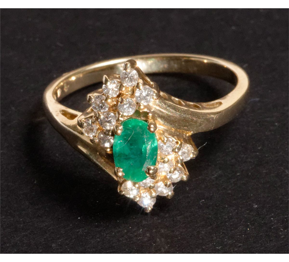 Dazzling ladies 4k yellow gold ring, with a sparkling oval center set emerald approx .5ct, and features 16 white side diamonds. Est. $500-1000