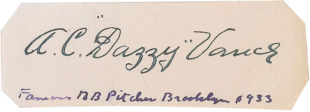 Baseball Hall of Famer (1891–1961) who was the dominant National League pitcher of the 1920s. Vintage fountain pen signature, “A. C. 'Dazzy’ Vance,” on an off-white 3.5 x 1.25 clipped slip with a collector’s notation along bottom. In fine condition, with a couple thin areas of paper and clipped edges and corners.