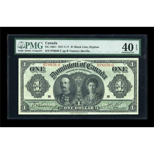 <B>Dc-18d-i $1 1911</B></I><BR> A nice example of the last of the 1911 ones. PMG <B>Extremely Fine 40 EPQ.</B></I><BR><I>From The Thomas M. Flynn Collection</B></I><BR><BR><b>Shipping:</b> Coins & Currency (<a target="_blank" href="http://www.heritageauctions.com/common/shipping.php">view shipping information</a>)