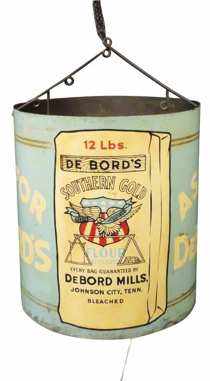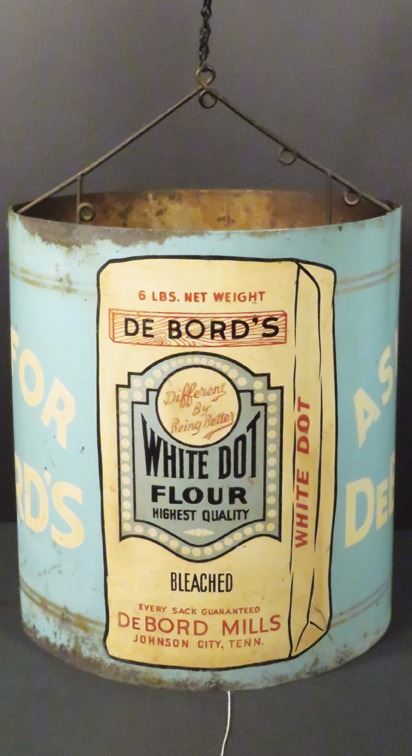 De Bords White Dot Flour String Holder. De Bord Mills, Johnson City, Tenn. Some restoration, fair to good condition. 12 inches tall X 11 inch diameter.
