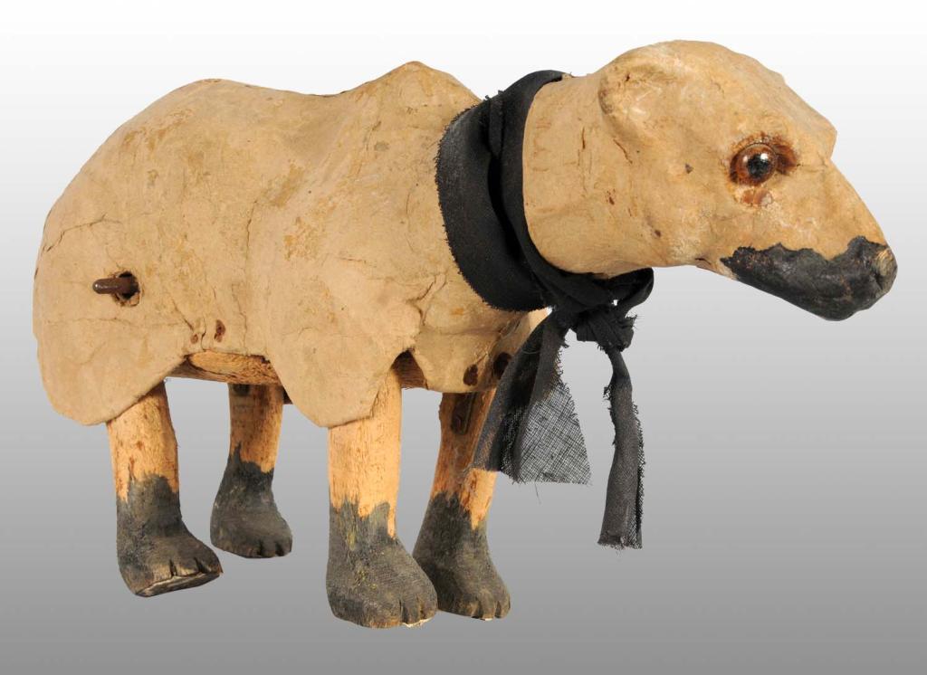 Description Paper mache and wood, possibly missing covering. When wound bear walks and turns head. Works sluggishly and key is present. Condition (Very Good). Size 14" x 7 - 1/2".