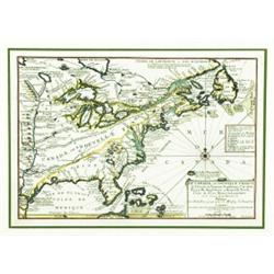 LE CANADA, OU NOUVELLE FRANCE, LA FLORIDE, LA VIRGINIE, PENSILVANIE, CAROLINE...1703, hand-coloured in outline, light spotting above cartouche and upper right corner, else very good. A very good view of the Eastern seabord and the Mississippi River. Framed.