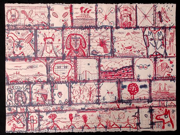 De Forest, Roy. Untitled, 1978. 22½ x 30". Signed "B.A.T. R DeForest 1978" at top center. Whimsical figures of animals, people and landscapes in red and blue. De Forest (1930-2007) was based in the Bay Area and taught at the University of California, Davis. He was a pioneer of the California Funk movement.