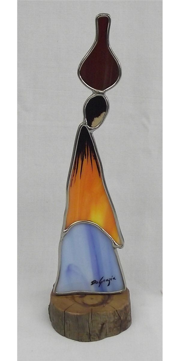 From the Nick and Suzanne Nicholas Collection we have a De Grazia Stained Glass Figure on Wooden Base, measures 11''H x 3''W, sticker on bottom reads ''Scottsdale Stained Glass Studio 5949 Fifth Ave. Scottsdale, AZ 85251, depicts Native American Woman carrying olla on top of her head, beautiful southwest colors, Ettore ''Ted'' DeGrazia (June 14, 1909 - September 17, 1982) was an American impressionist, painter, sculptor, composer, actor, director, designer, architect, jeweler, and lithographer. Described as ''the world's most reproduced artist'', DeGrazia is known for his colorful images of Native American children of the American Southwest and other Western scenes. DeGrazia also painted several series of exhibitions like the Papago Legends, Padre Kino, Cabeza de Vaca. Born to Italian immigrants, DeGrazia's family immigrated from San Pietro, Amantea, Calabria (Southern Italy). His parents, Dominic and Lucia DeGrazia, were strong people who worked very hard for their family of seven children. His father and uncles were copper miners in Morenci, Arizona Territory, where DeGrazia was born in 1909. Arizona achieved statehood in 1912. DeGrazia's graduation from Morenci High School was delayed until the age of 23. The family moved back to Italy in 1920. The move was a result of the Morenci mines closing that same year.