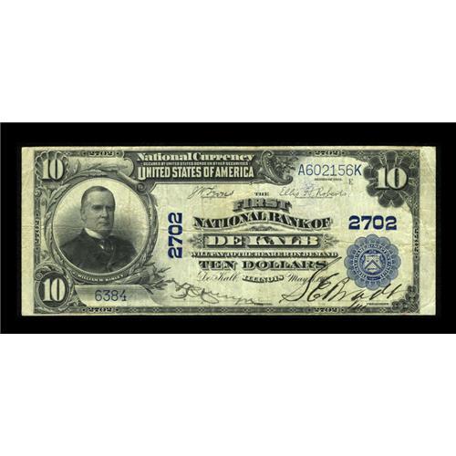 <B>De Kalb, IL</B></I> - $10 1902 Plain Back Fr. 624 <B>The First NB</B></I> Ch. # 2702<BR>Pleasing pen signatures are found on this piece from this farming community two hours west of Chicago. <B>Very Fine.</B></I><BR><I>From The Lincoln Collection</B></I><BR><BR><b>Shipping:</b> Coins & Currency (<a target="_blank" href="http://www.heritageauctions.com/common/shipping.php">view shipping information</a>)
