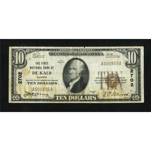 <B>De Kalb, IL</B></I> - $10 1929 Ty. 1 <B>The First NB</B></I> Ch. # 2702<BR> Type Ones only were issued in small size as this bank liquidated in early 1934. This note is the sixteenth to turn up on this bank according to the census. It is a <B>Very Fine</B></I> with a few stains on the face.<BR><BR><b>Shipping:</b> Coins & Currency (<a target="_blank" href="http://www.heritageauctions.com/common/shipping.php">view shipping information</a>)