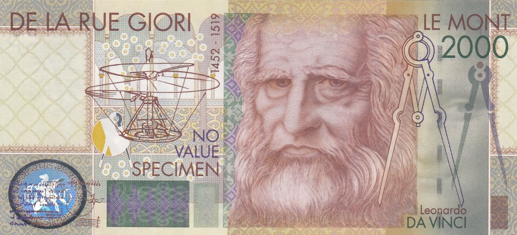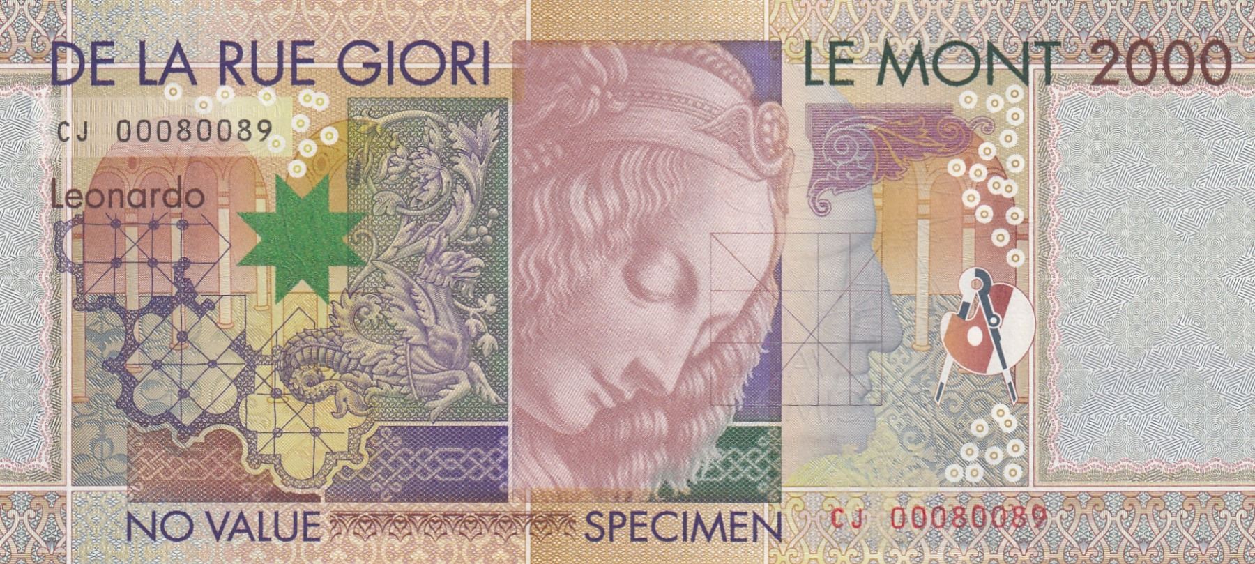 De La Rue, 2000 Unit, Le Mont, SPECIMENbr/De La Rue Giori, Leonardo Da Vinci
