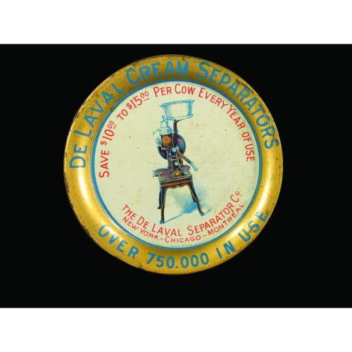 De Laval Cream Separator Tin Tip Tray, over 750,000 in use. Paint chips around rim otherwise excellent condition. 4 1/4 inch diameter.