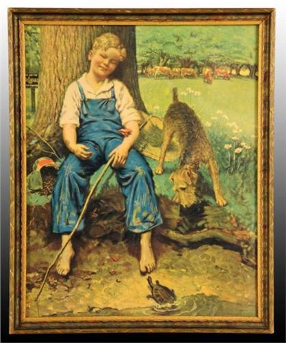 Description 1930s. Framed under glass. Features a boy fishing. Only light wear. Condition (9.0, Near Mint). Size 11" x 14".