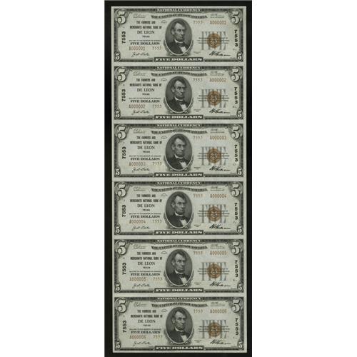 <B>De Leon, TX</B></I> - $5 1929 Ty. 2 <B>The Farmers & Merchants NB</B></I> Ch. # 7553 Uncut Sheet<BR>This serial number 1-6 uncut sheet is from the Irish Collection. The top note shows a tiny unobtrusive spot on the back. Still <B>Gem Crisp Uncirculated</B></I> overall due to its centering and embossing.<BR><BR><b>Shipping:</b> Coin/Currency (<a target="_blank" href="http://www.heritageauctions.com/common/shipping.php">view shipping information</a>)
