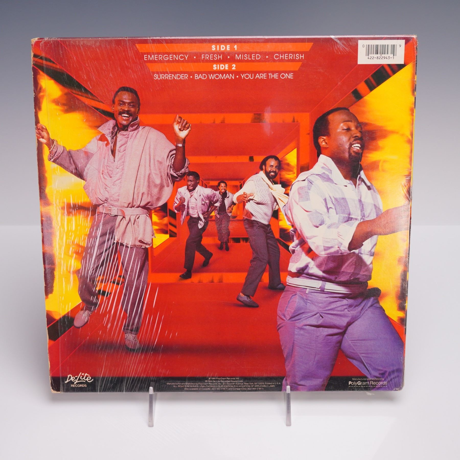 This 12-inch stereo vinyl LP features the 1984 studio album Emergency by Kool & The Gang, released under the De-Lite Records label. The album includes the full track list with hit singles such as "Fresh," "Misled," "Cherish," and the title track "Emergency," divided across two sides. Side 1 includes "Emergency," "Fresh," "Misled," and "Cherish," while Side 2 presents "Surrender," "Bad Woman," and "You Are the One." The front and back cover design showcases dynamic imagery of the band members in motion against a stylized red and orange backdrop, with the original shrink wrap and promotional sticker intact. The central label on the record displays the De-Lite Records branding.