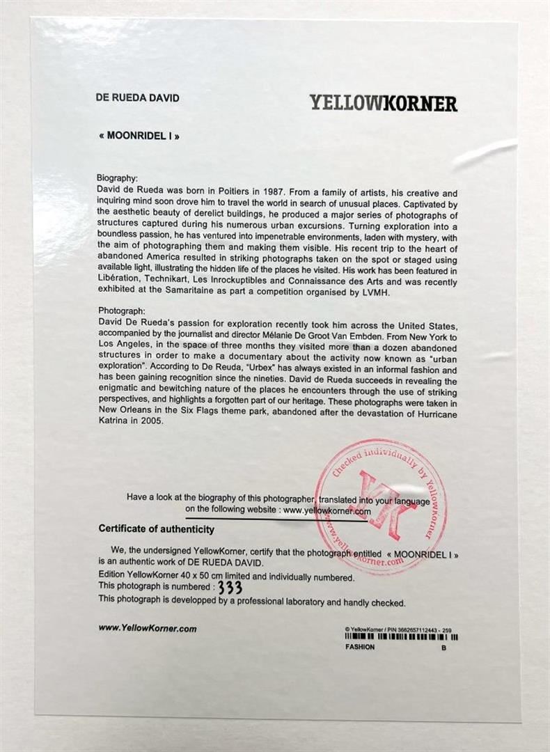 De Rueda David Moonridel I YellowKorner Certified Photograph. Certificate of Authenticity from YellowKorner affixed to the back. Matted Dimensions 16"x20". Protected with Clear Mylar Sleeve.