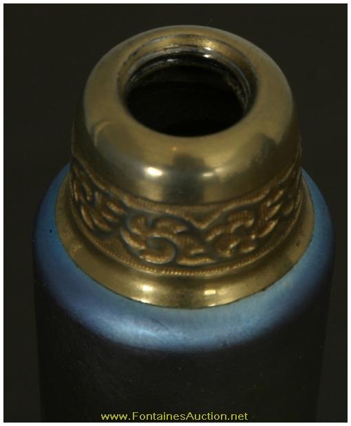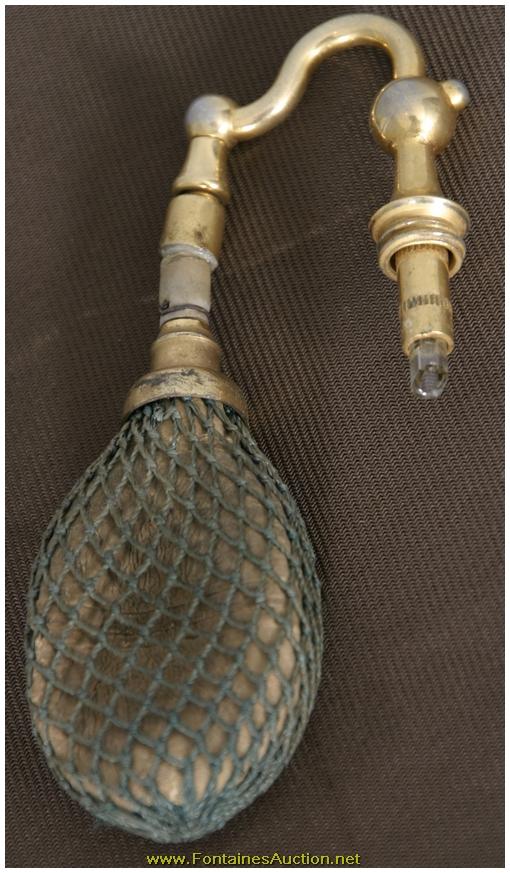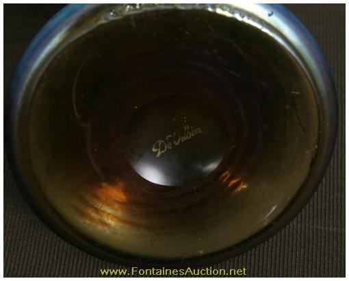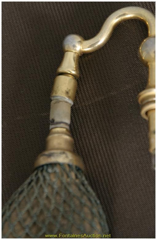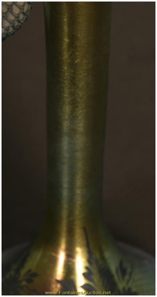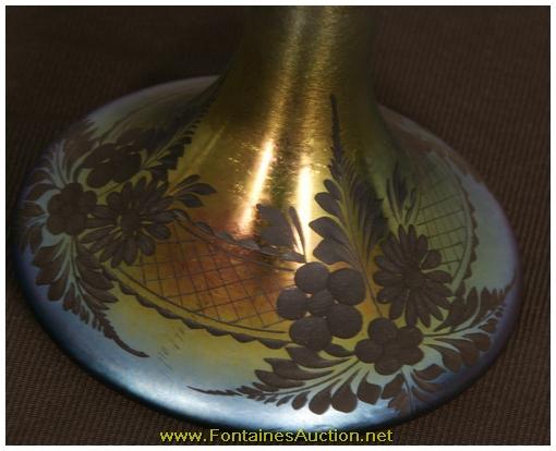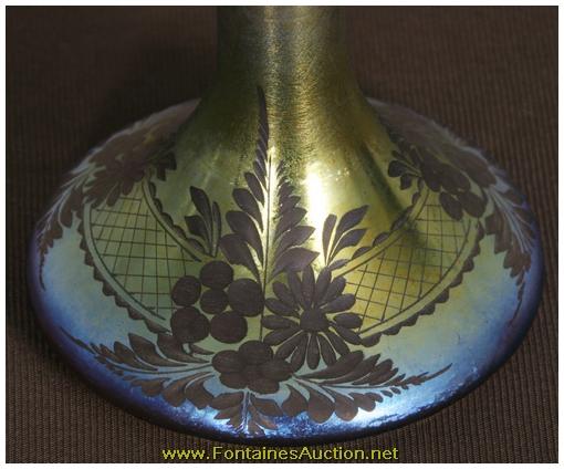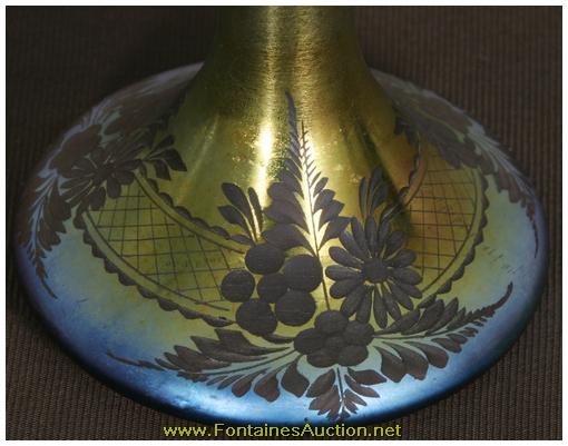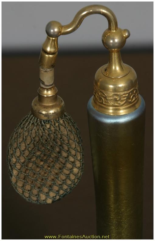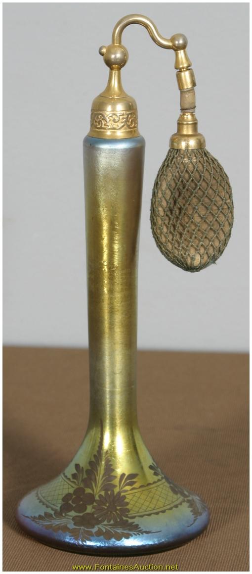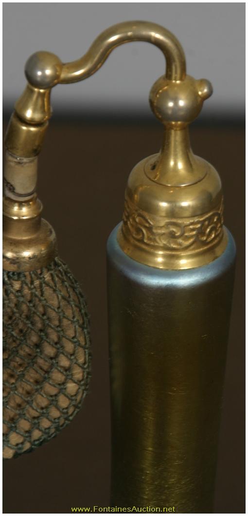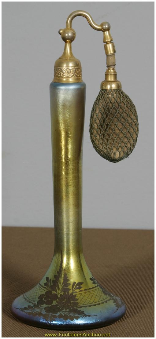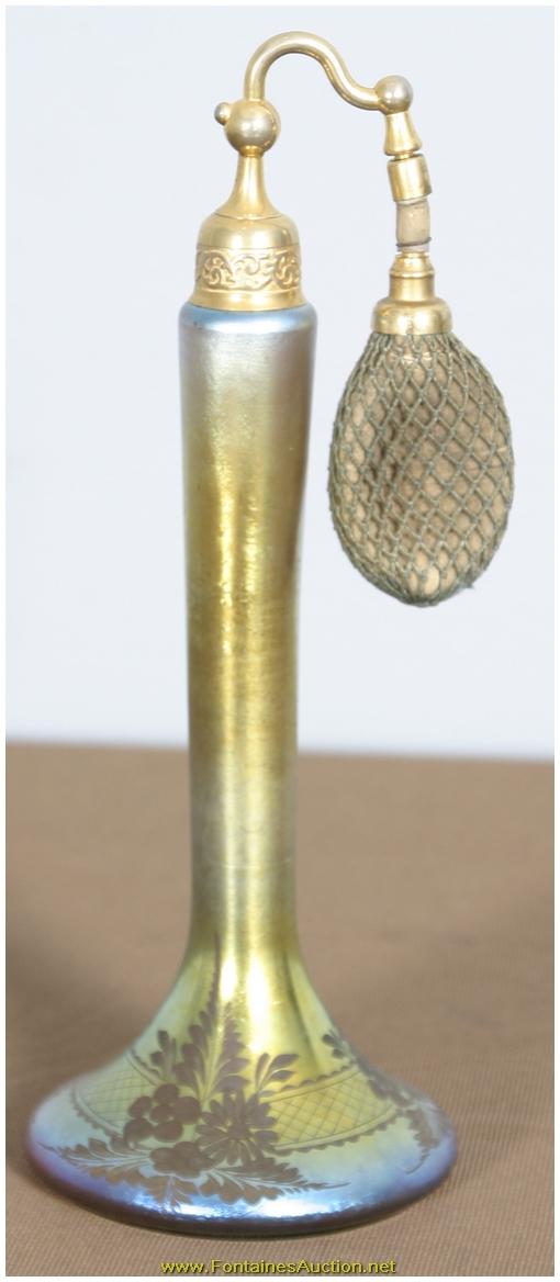 De Vilbiss Gold Iridescent Etched Atomizer. A long thin tapered stem with a trumpeted platform; the platform has an etched border with 3 floral clusters with leaves on a crosshatched border. Has a gold iridescent finish, with heavy silver and hints of blue. Gilt brass fitter with a long thin arm reaching to the atomizer bulb, has some repair to the rubber fitting, internal glass stem is broken. 3.5"W x 9"H. Estimated Value$400 - 600.