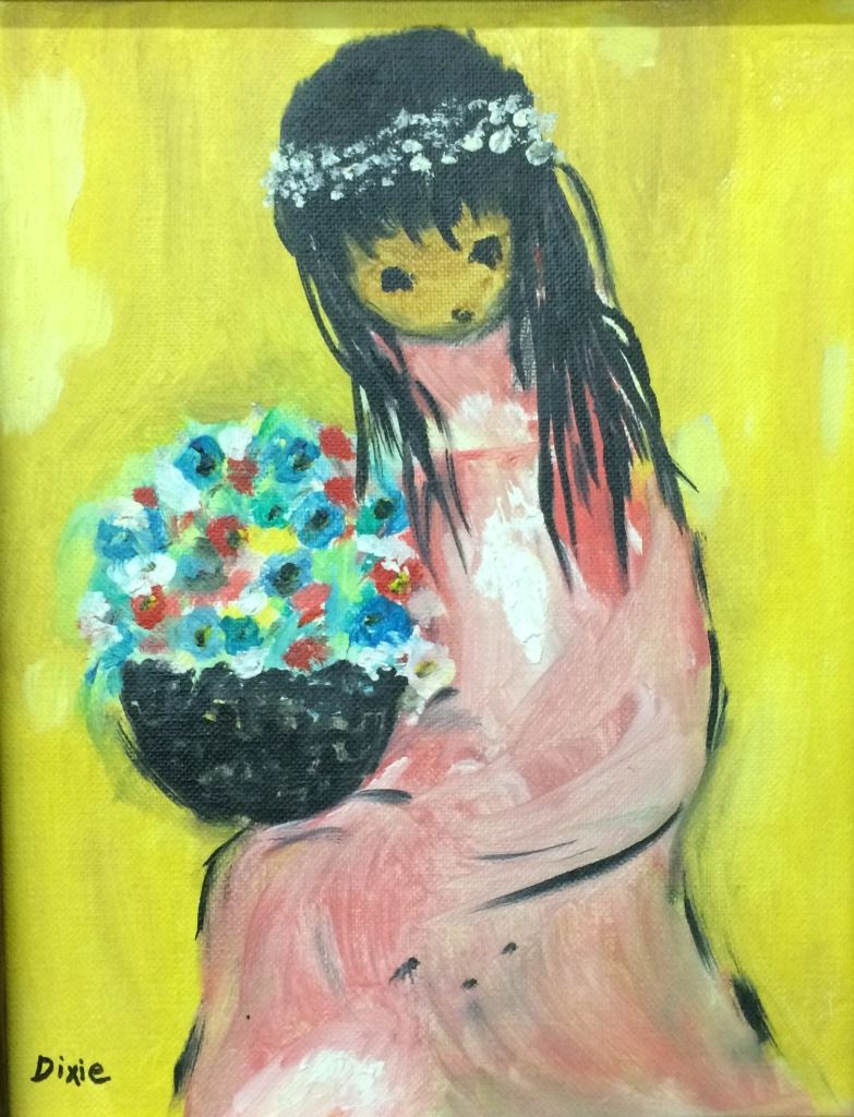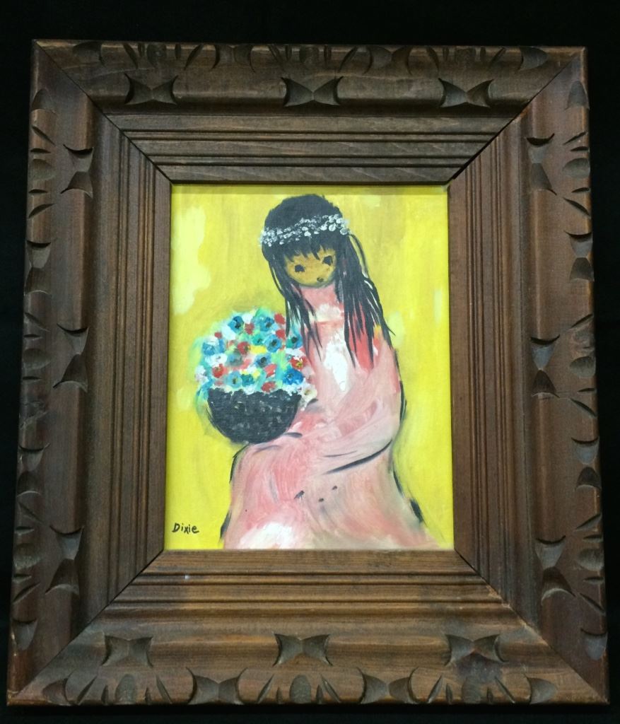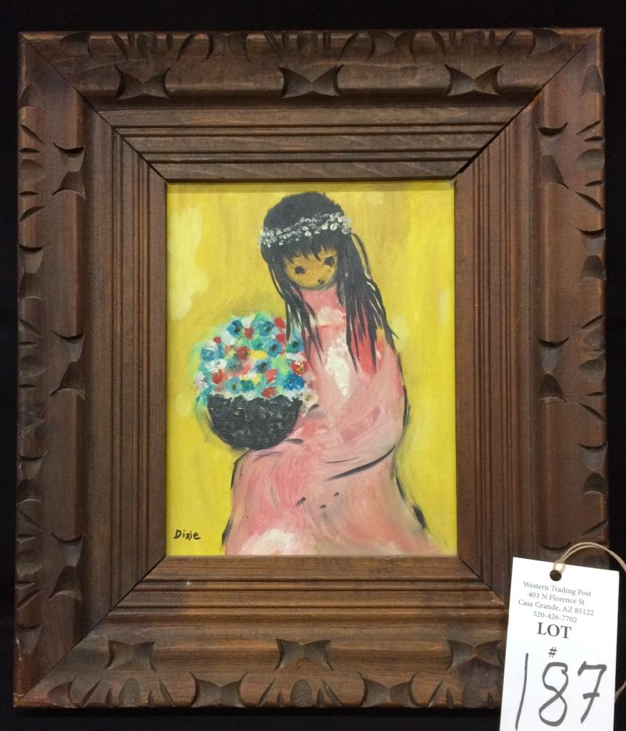 This one-of-a-kind, original oil painting in the style of DeGrazia is signed “Dixie”. It measures 13” X 15” with frame. Good condition. Shipping: There will be a $7 handling / packaging fee for shipping this lot. The actual cost of postage will be added on top of that.