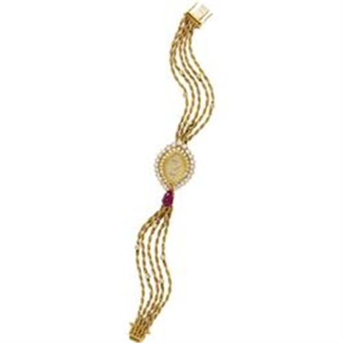 <B>DeLaneau Lady's Diamond, Ruby, Gold Multi-Chain Integral Bracelet Wristwatch, Modern</B></I><BR><BR>Case: 27 x 20 mm, navette-shaped, 18k yellow gold with single and full-cut diamond bezel; together with pear-shaped ruby cabochon lug; caseback stamped 750 18k G248 16B2 with Swiss hallmarks<BR>Dial: goldtone with sandblasted finish, goldtone "Dauphine" hands and sapphire crystal<BR> Movement: 2 jewels, unadjusted Swiss Quartz<BR>Bracelet: composed of 10 18k yellow gold twisted rope chains, accented by bezel set full-cut diamonds, completed by a box clasp with dual figure-8 safeties<BR>Signed: double signed Delaneau on the dial and clasp<BR>Gemstones: total diamond weight for the watch is approximately 1.65 carats. <B>Condition Report:</B> Type:DeLaneau Lady's Diamond Ruby 18k Gold Mulit-Chain Bracelet Watch<BR><BR>Signed:DeLaneau<BR><BR>Dial:Sandblasted Gold<BR><BR>Hands:Dauphine<BR><BR>Metal:18k Yellow Gold<BR><BR>Gram Weight:25.60 Grams<BR><BR>Case #:750 Swiss Hallmarks G248 16B2<BR><BR>Watch Movement:2 Jewels Unadjusted Swiss Quartz<BR><BR>Length:7 inches<BR><BR>Width:20 mm<BR><BR>Height:27 mm<BR><BR>Band:Multi-Chain 18k Yellow Gold Integral Bracelet with Bezel Set Diamond Accents<BR><BR>Circa:Modern<BR><BR>Condition: Very Good. Watch is in running order.<BR><BR>Stones:Inner frame: 27 single-cut diamonds app 0.34 ctw; outer frame 24 RBC app 1.06 ctw; 10 RBC in bezels app. 0.25 ctw = app 1.65 ctw + 1 pear-shaped ruby cabochon measuring 8.30 x 5.35 x 3.50 mm<BR><BR>Notes:Watch retails for $1600.00<BR> <BR><BR><BR><BR><b>Shipping:</b> Miscellaneous Collectibles, Smal (<a target="_blank" href="http://www.heritageauctions.com/common/shipping.php">view shipping information</a>)