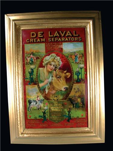 DeLaval Cream Separator Tin Sign in gold frame. Stains, rubs and scratches otherwise fair to good condition. 30 X 41 inches.