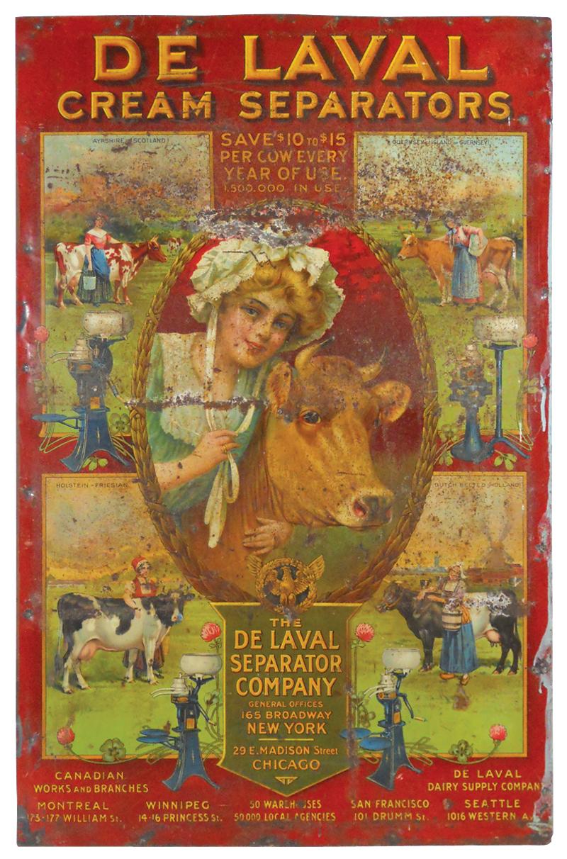 DeLaval Cream Separators sign, self-framed litho on metal, pictures the DeLaval Milkmaid, c.1915, Fair/Good cond w/overall wear, 31"H x 20"W.