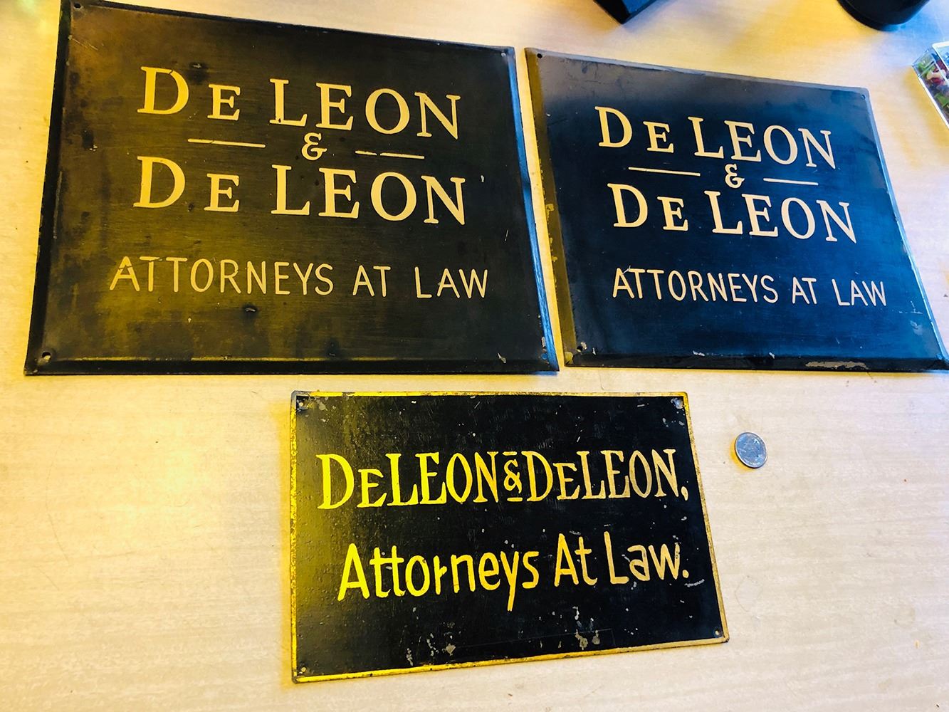 3 Signs from the original law firm of DeLeon & DeLeon. The husband and wife team of DeLeon & DeLeon, Attorneys at Law, was well know in the Waterbury, CT area as long term, esteemed members of the law community, who focused on immigration law and helped many, many of the areas immigrants. These 3 signs were from their original law firm in Waterbury, CT. They were also known to see clients in their Watertown, CT home. pd estate.
